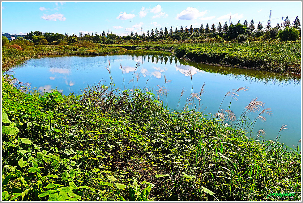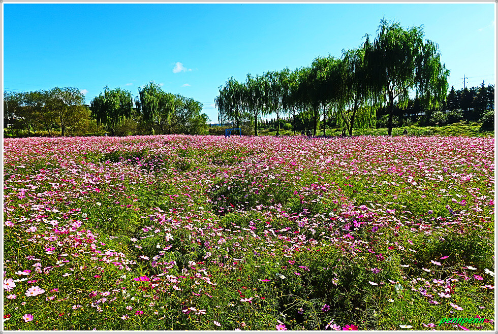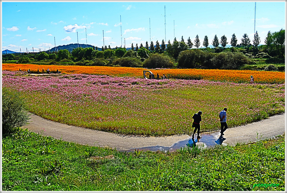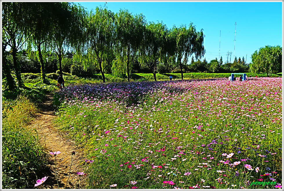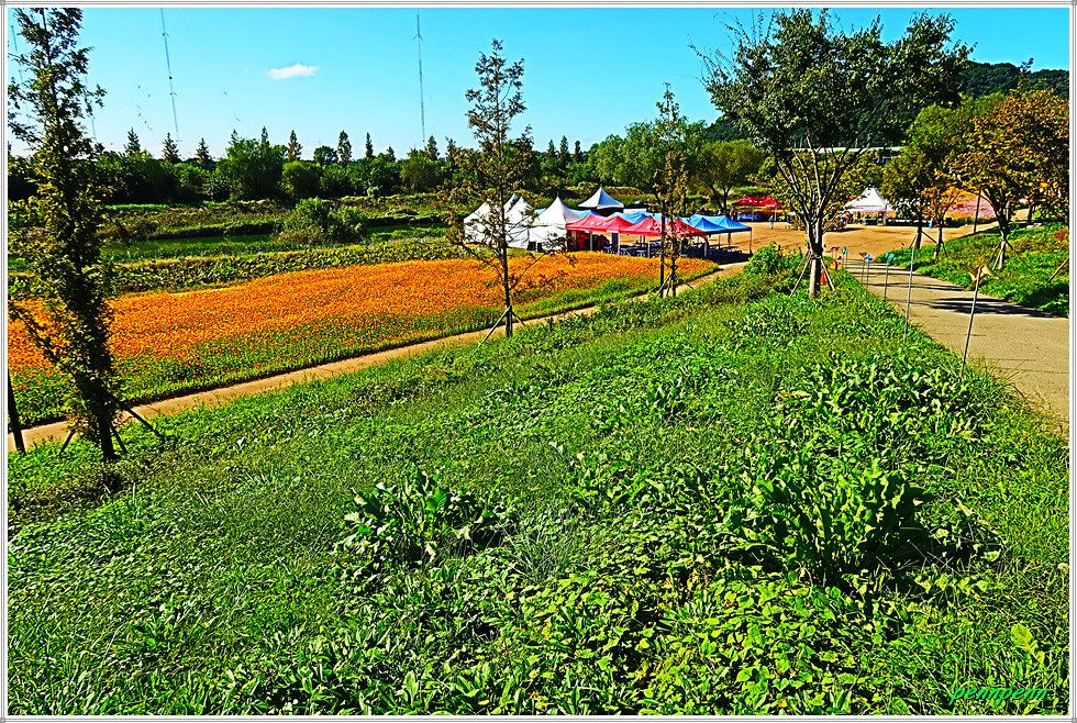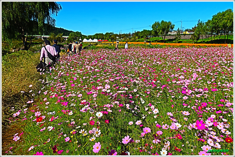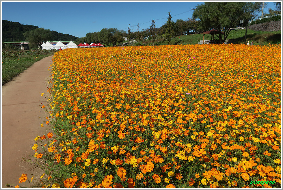 창릉천으로 합류하는 성사천의 징검다리를 건너 꽃밭으로 내려섭니다. 이쪽에는 일반 코스모스가 군락을 이루어 피어 있습니다. 여러 곳에 기념사진 촬영용 사각액자틀이 있지만 강매석교공원 또는 창릉천 꽃밭을 알리는 글씨가 표기되어 있지 않은 게 옥의 티입니다. 연꽃단지가 있는 곳은 행신생태공원 연꽃부지 시범사업 안내문이 세워져 있군요.