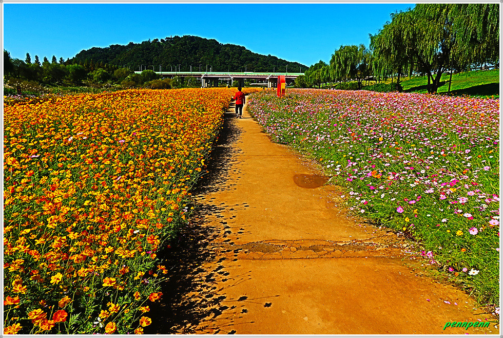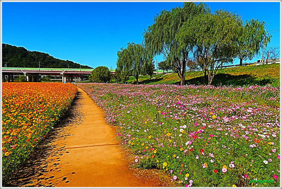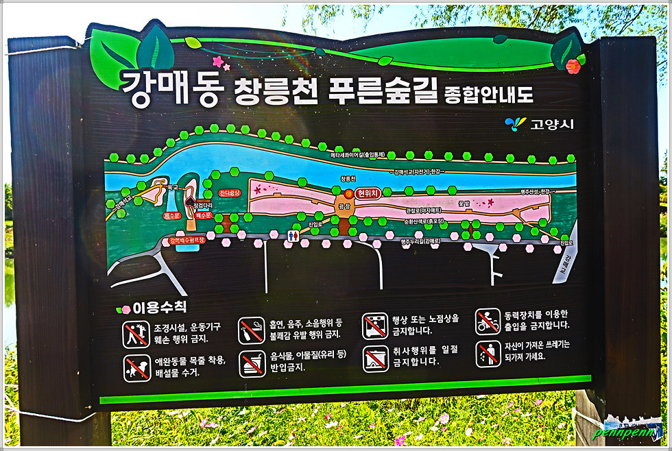 창릉천 제방도로로 올라 코스모스꽃밭을 내려다봅니다. 제방도로에서 내려다보니 핑크색 코스모스와 주황색 황화코스모스가 반반씩 둔치를 뒤덮은 모습이 장관입니다. 주변을 둘러싼 버드나무도 코스모스와 어우러져 이곳의 풍경을 더욱 아름답게 만듭니다. 중앙광장을 내려다보면서 발걸음을 옮기니 강매마을의 유래관련 안내문이 있군요. 이 창릉천을 따라 조성된 길이 행주누리길입니다.(2025. 10. 16).