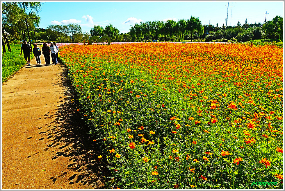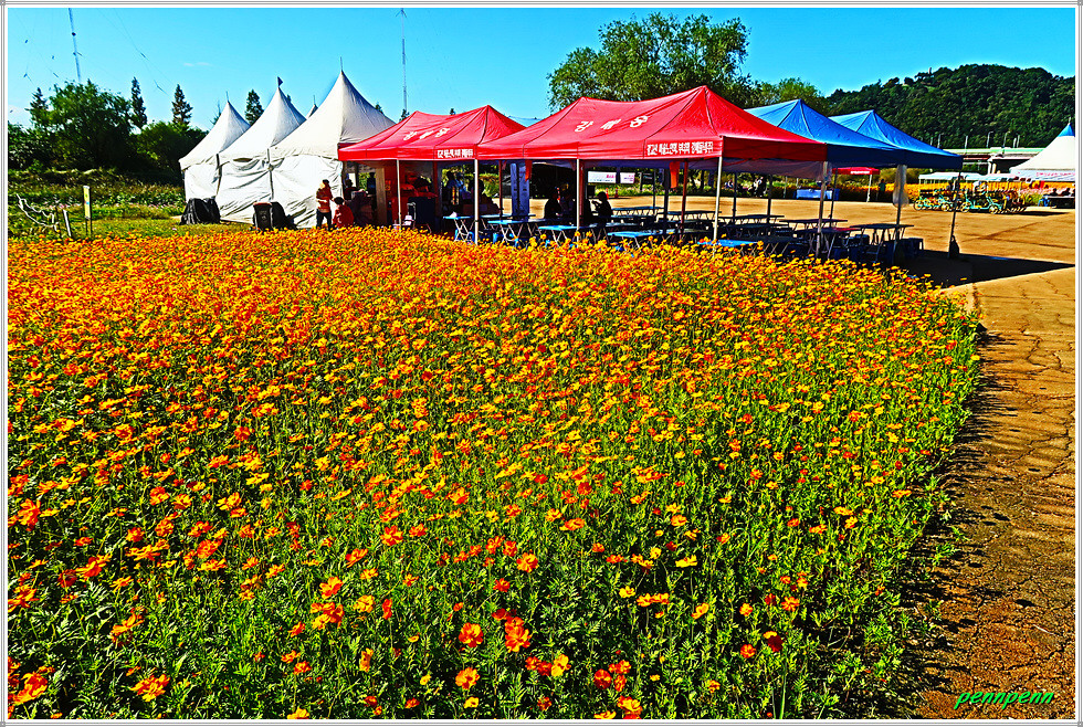 연꽃부지가 있는 곳에서부터는 일반코스모스가 아닌 황화코스모스가 지천으로 피어 있습니다. 황화코스모스 국화과에 속하는 한해살이풀로 원산지는 멕시코 또는 중앙아메리카입니다. 일반적으로 코스모스는 하면 분홍색, 흰색, 자주색이지만 황화코스모스는 이름처럼 노란색 또는 주황색 꽃이 특징입니다.