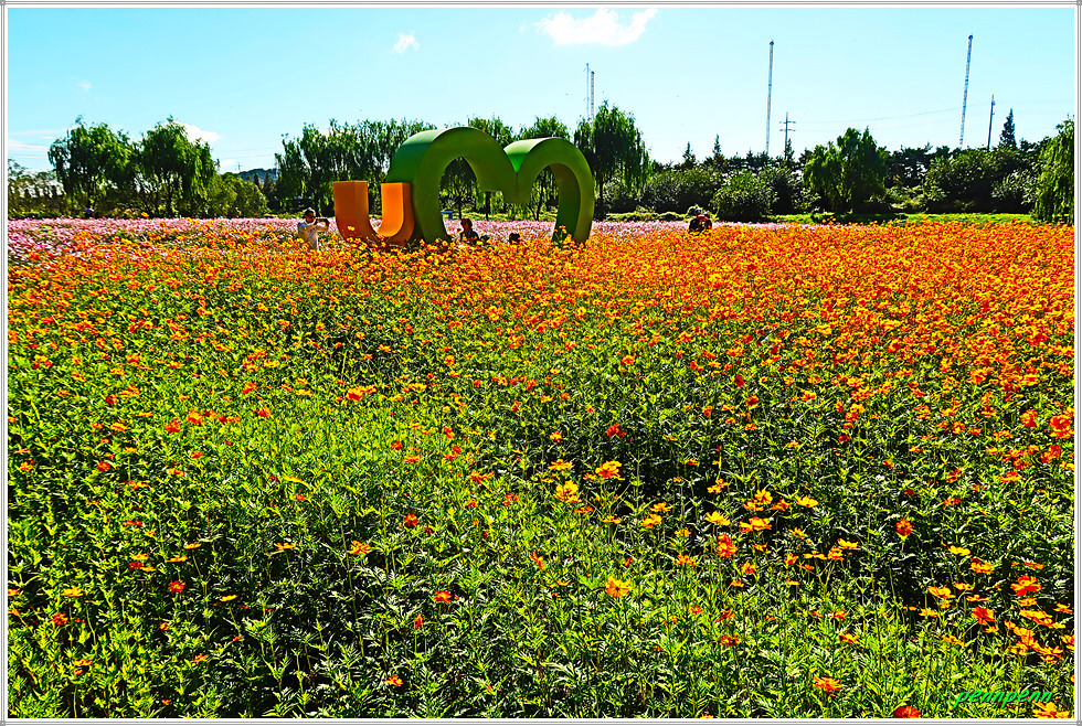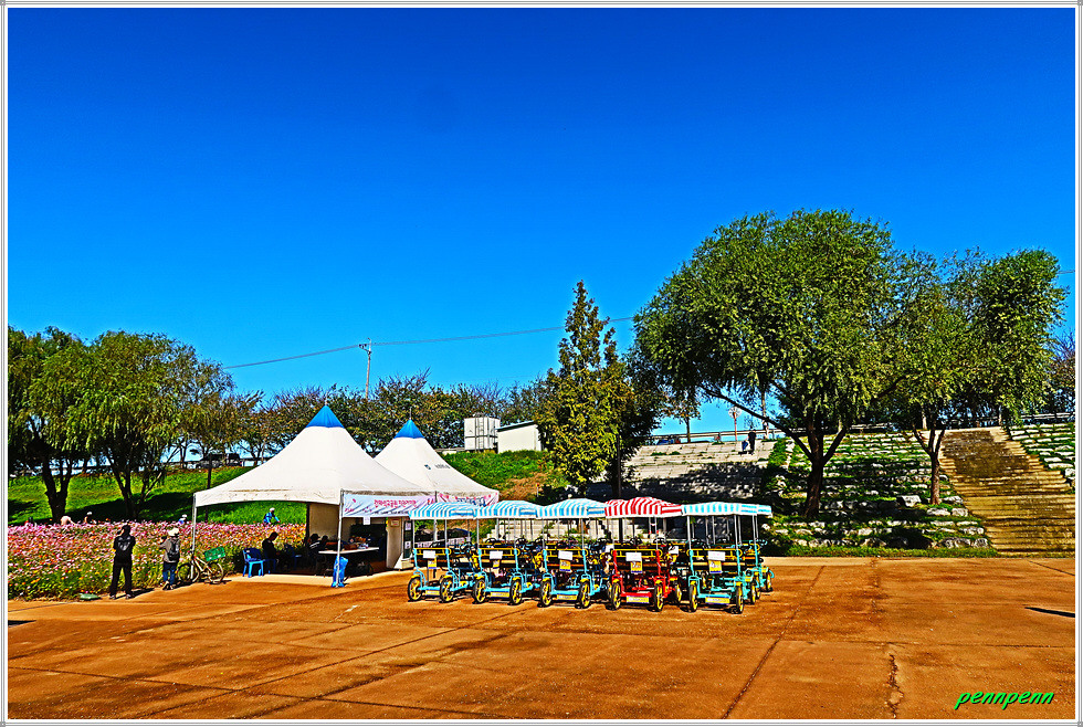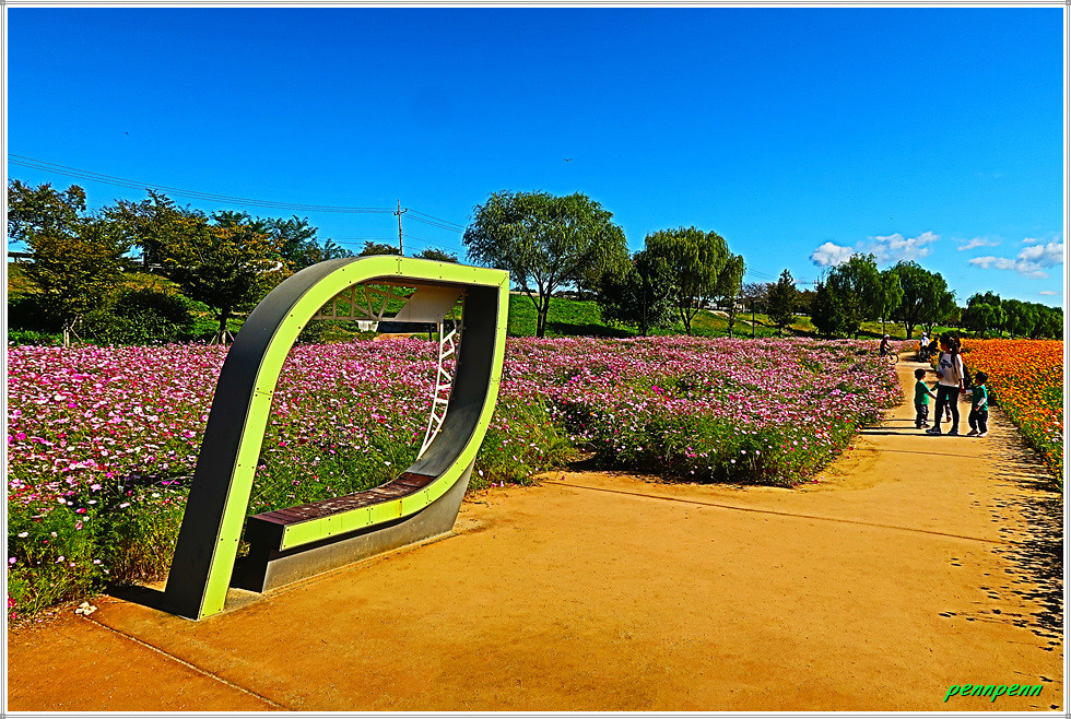 중앙광장에는 매점과 공연장 그리고 자전거대여점이 있는데 이를 지나면 일반코스모스와 황화코스모스가 반반씩 군락을 이루고 있습니다. 하트(♥)와 U자 조형물은 LOVE U(you)를 표기한 모양입니다. 행주산성이 있는 덕양산 방향에는 방화대교 북단의 고가도로가 보입니다.