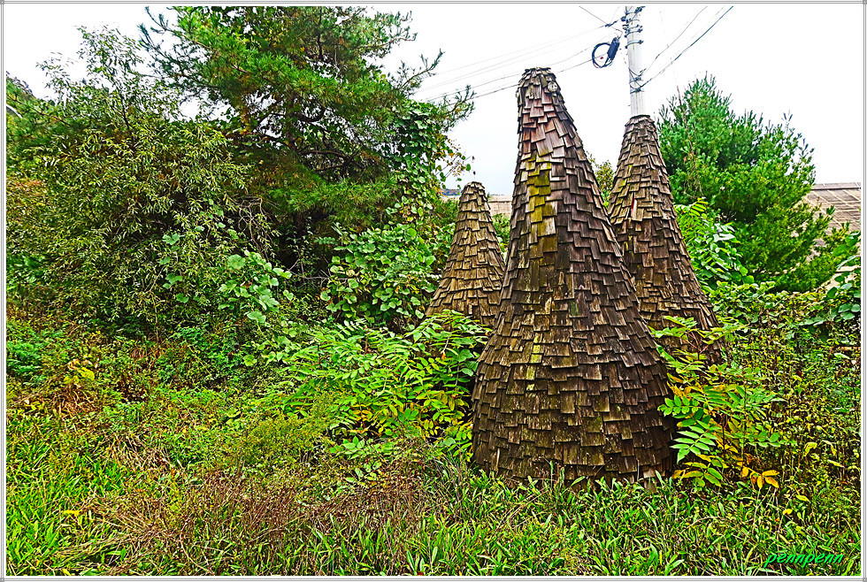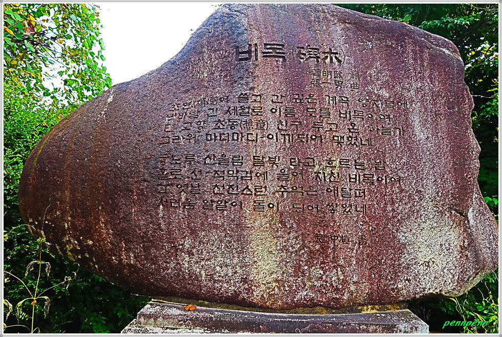 위로 올라 돔형 건축물을 지나면 우측 숲에 비목비가 있는 소위 비목공원입니다. 평화의 댐 경내에 있는 비목공원은 국민가곡 "비목"의 탄생지입니다. 1960년대 중반 평화의 댐 북방 14km 백암산 계곡 비무장지대에 배속된 한 청년장교는 잡초가 우거진 곳에서 이끼 낀 무명용사의 돌무덤 하나를 만납니다. 녹슨 철모, 이끼 덮인 돌무덤, 그 옆을 지키고 있는 새 하얀 산목련, 화약 냄새가 쓸고 간 깊은 계곡을 붉게 물들이는 석양. 그는 돌무덤의 주인이 자신과 같은 젊은이였을 거라는 깊은 애상에 잠겼습니다. <비목(碑木)>은 청년장교 출신 한명희의 시(작사)에 장일남이 곡(작곡)을 붙인 노래로 70년대 중반부터 널리 애창되기 시작해 불후의 가곡이 되었습니다.