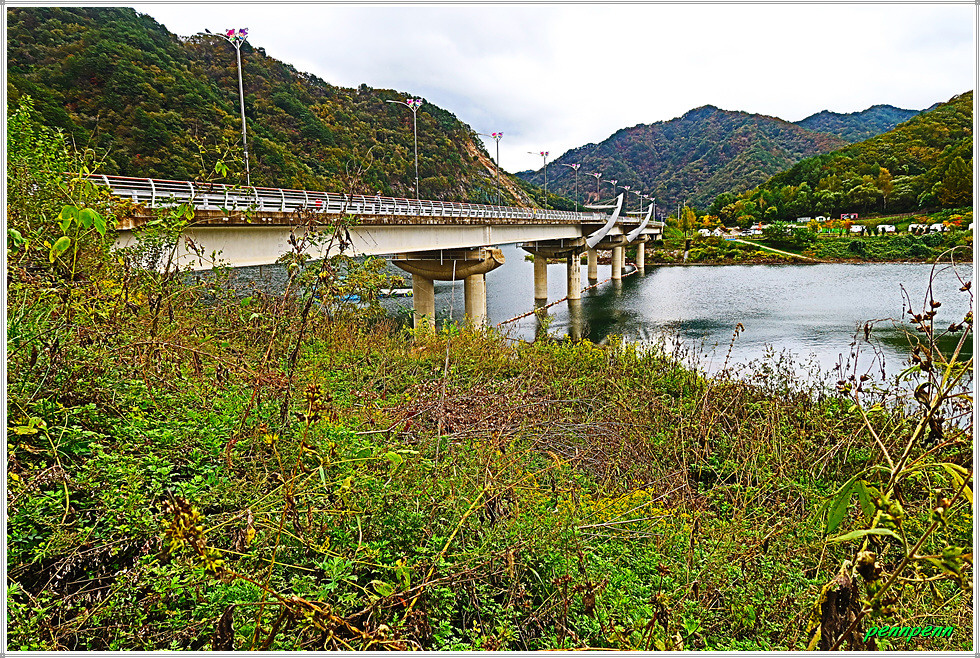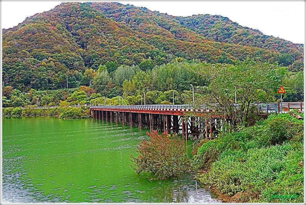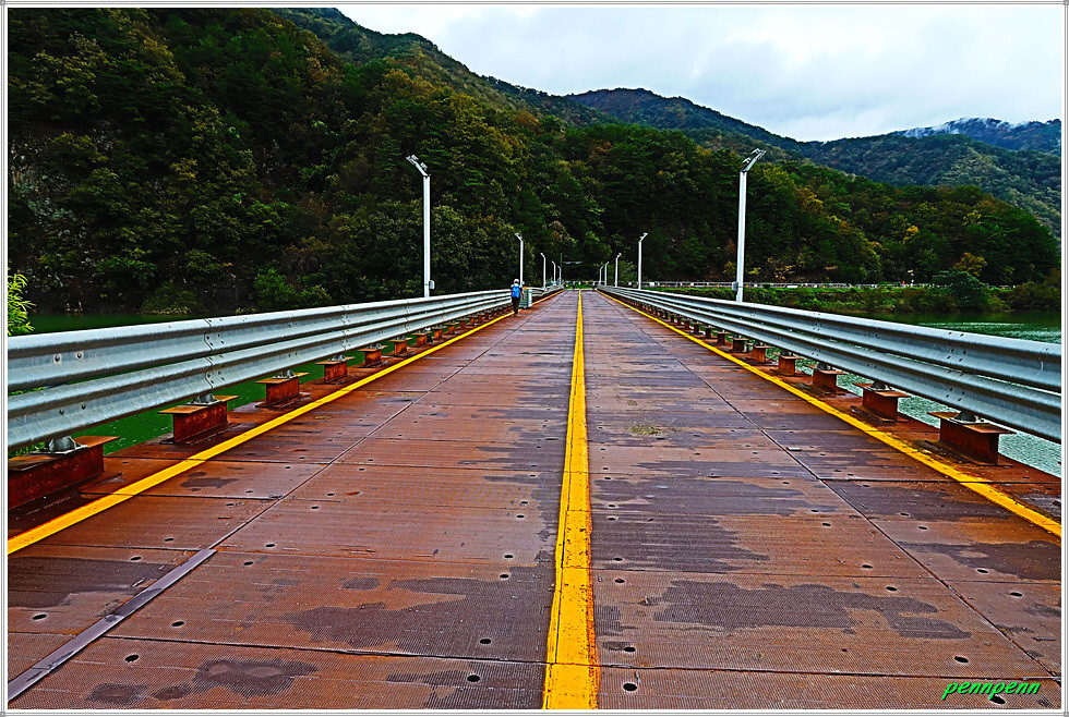 백암산케이블카 입구에 있는 화장실의 2층옥상은 바로 조망대인데 진행방향으로 가야할 안동철교가 보입니다. 이어서 안동철교를 지나갑니다. 화천읍 풍산리 소재 안동철교는 평화의 댐 건설 때 북한강 안동포구에 조립식으로 건설한 철교입니다. 이 조립식 철교는 당초 평화의 댐 건설용으로 그 후에는 군사용으로 사용되었지만 앞으로는 평화의 댐으로 가는 관광객들이 많이 이용할 것입니다. 평화의 댐에서 북한강을 따라 올라가면 안동포(安東浦)에 다다르게 되는데 옛날 금강산에서 소나무 뗏목이 내려오다가 쉬어가기도 하고 때로는 돛을 펄럭이며 한강에서 소금배가 와 닿기도 했던 곳입니다.