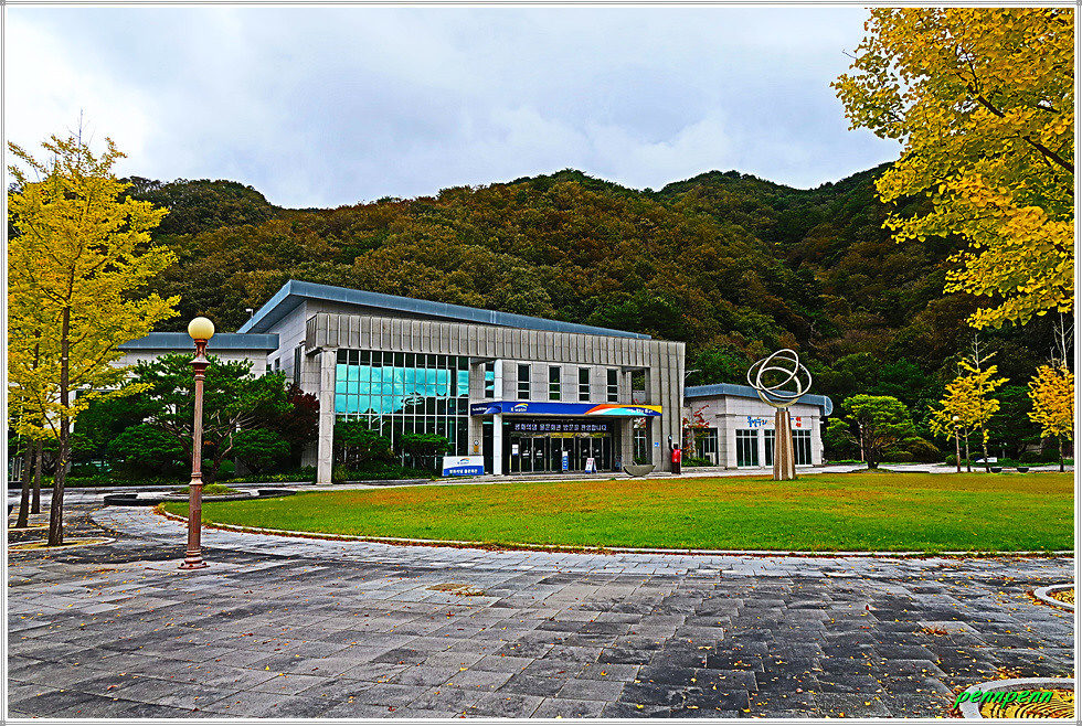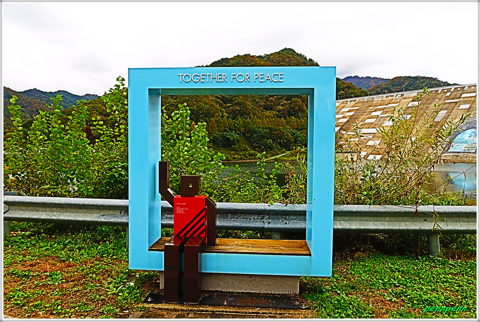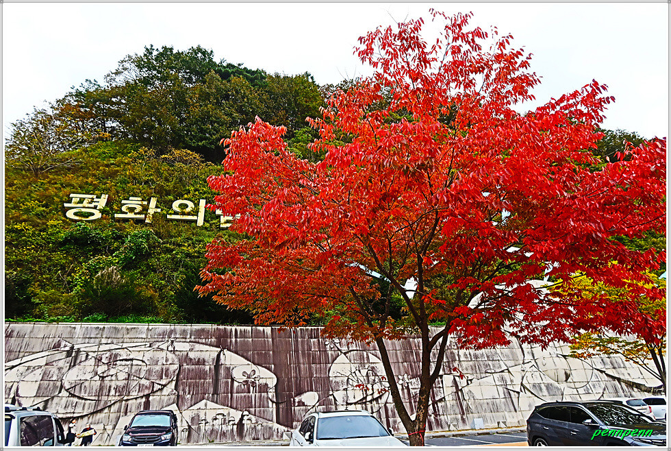 비목탑 위로 오르면 한국수자원공사 물문화관이 있는데 앞뜰에는 금년 가을 들어 가장 화려한 단풍을 만났습니다. 수달조형물을 지나면 세계평화의 종이 있는데, 이 종은 화천군이 평화의 댐 일대를 평화의 상징지로 알리기 위해 세계 분쟁지역에서 모은 탄피를 녹여 만든 30t규모의 종입니다. 이웃한 노벨평화의 종은 “세계평화의 종” 준공식에 참석하였던 노르웨이 목사(욘 요네스)가 노벨상 발상지인 노르웨이 및 스웨덴과 대한민국에 제2의 평화의 종을 설치하여 평화울림을 위한 세계화를 제안한 것으로 이 종은 노르웨이 시청이 기증한 것입니다.