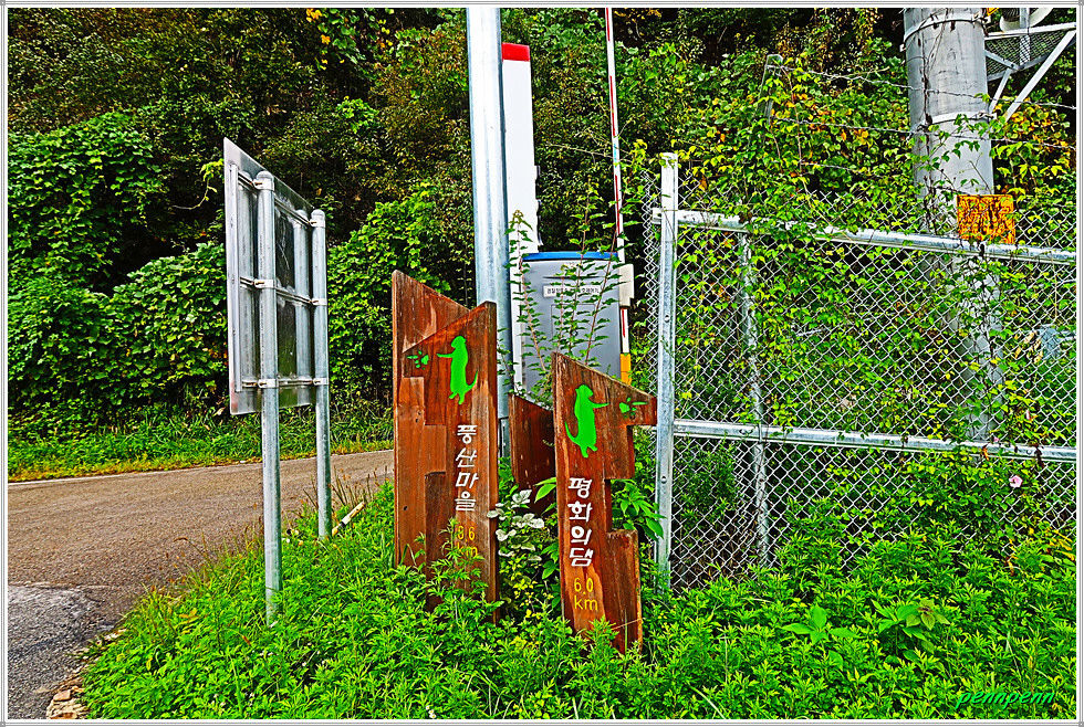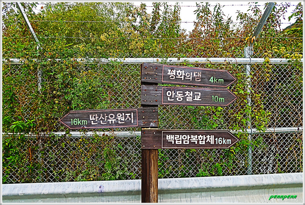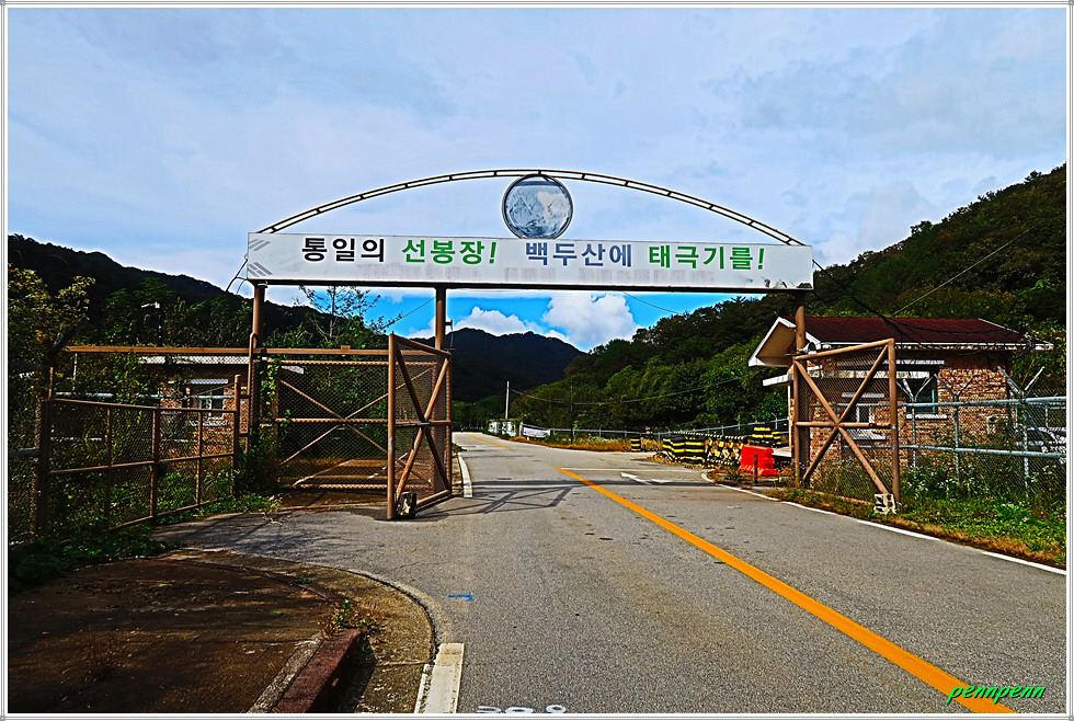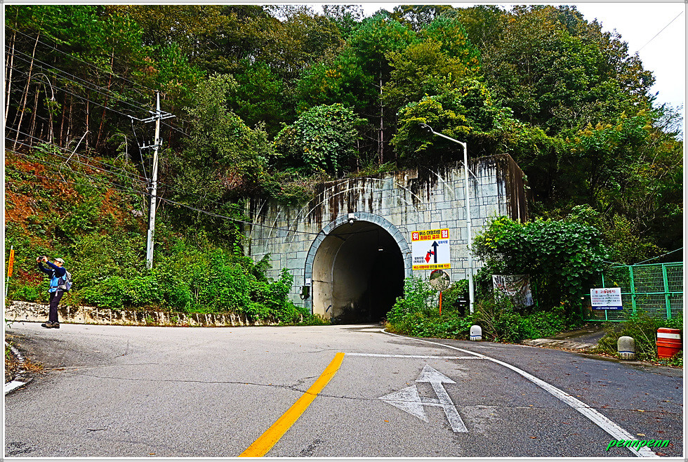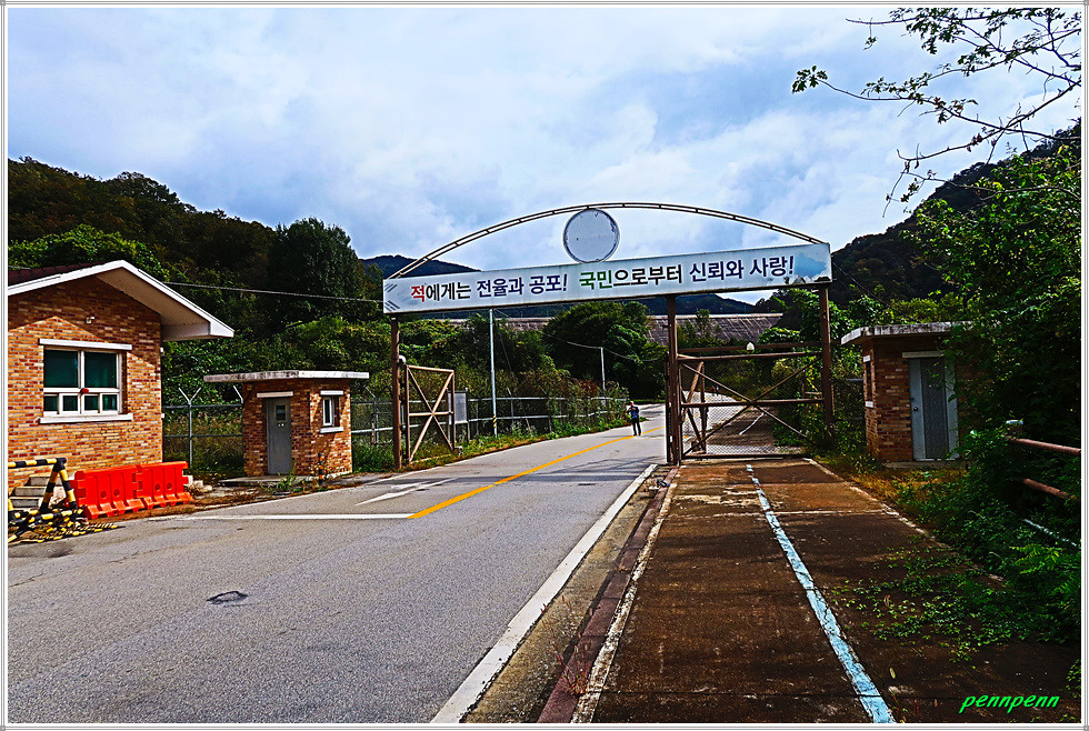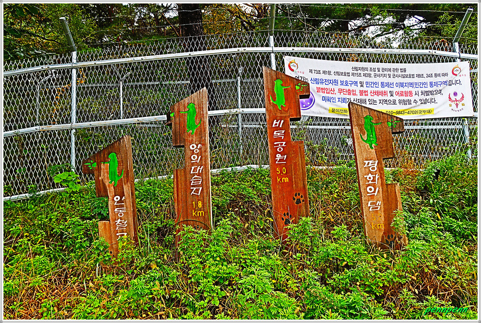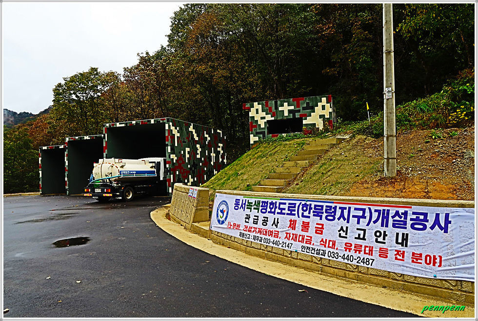 공사주변이 말끔하게 정리되어 있는 2차선 도로의 내리막을 걸어갑니다. 새로운 도로를 개설하면서 구(舊) 도로의 선형도 개선해 놓았군요. 새벽까지 내렸던 비가 그쳐 상쾌한 공기를 마시며 내려가노라니 그야말로 발걸음이 가볍습니다. 대천차방호벽과 실개천을 가로지르는 단거교를 지나가는데 도로변 철조망의 울타리에는 민통선(민간인출입통제선)을 알리는 경고문이 계속 나옵니다. 도로는 통행이 허용되지만 울타리를 넘으면 안 되는 통제구간이기 때문입니다.