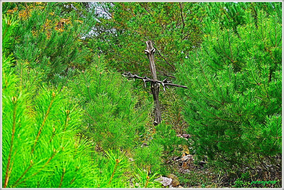 비목비석에서 위쪽을 올려다보면 십자가 형상의 나무가 있는데 바로 비목(碑木)을 재현해 놓은 것입니다. 글쓴이가 14년 전(2011년) 이곳을 찾았을 때는 십자가형 나무에 철모가 올려 져 있었는데 이제는 철모가 사라지고 없어 무척 아쉽습니다.