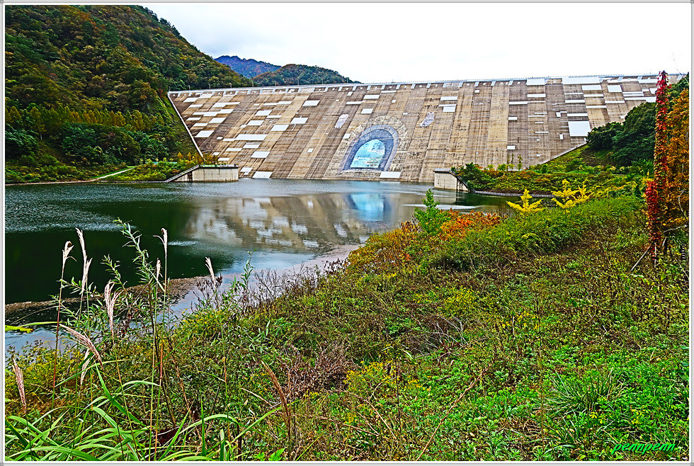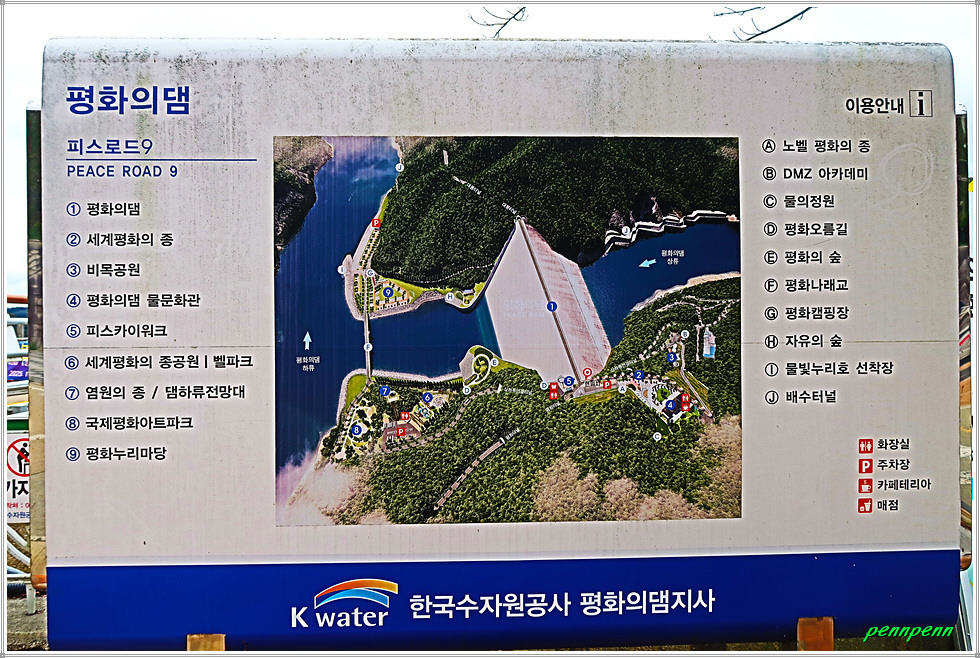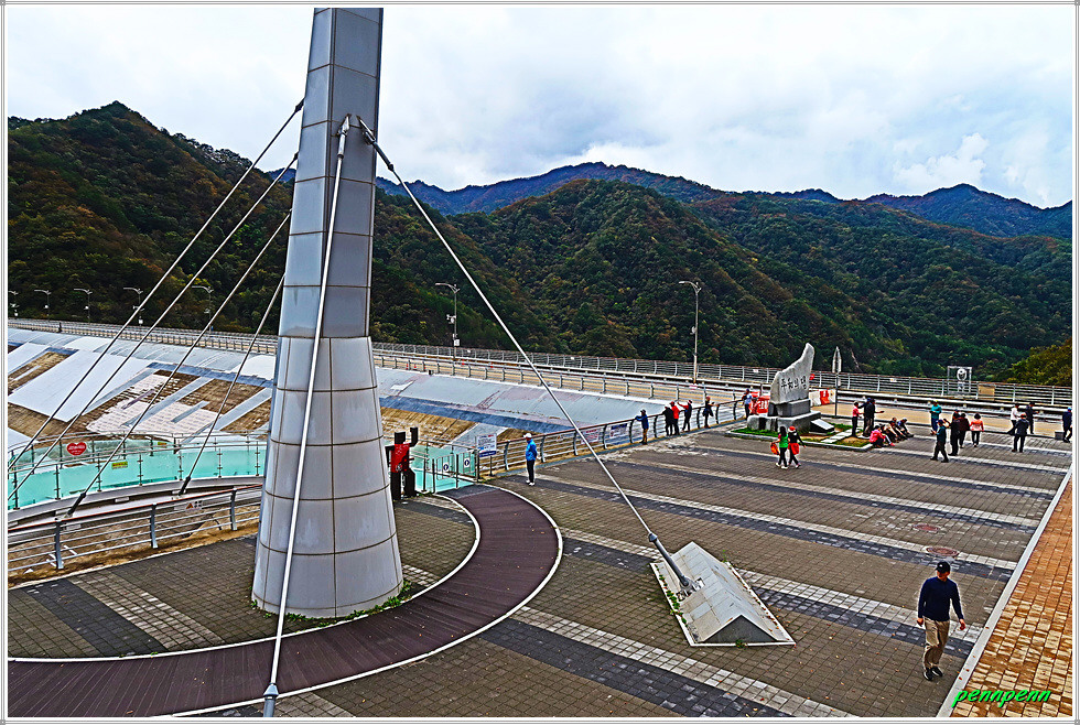 광장에는 평화의 댐 표석이 있고 이웃한 카페테리아(매점)의 2층으로 오르면 거대한 평화의 댐을 내려다 볼 수 있습니다. 화천군 화전읍 동촌리 소재 평화의 댐은 북한의 임남댐(금강산댐)의 수공(水攻) 위협에 대비해 1980년대 중반 국민성금과 정부예산으로 화천댐의 북한강 상류(구만리)에 건설한 댐(1차 건설 : 댐 높이 88m)입니다. 평화의 댐은 북한강에 위치한 임남댐으로부터 물길 따라 하류 36km 지점, 화천댐으로부터 물길 따라 상류 24km에 위치하고 있습니다. 평화의 댐은 1990년대 후반 수해 시 홍수조절 기능이 입증되면서 관광명소로 자리 잡았습니다. 여기서 댐 하부 평화나래교 방면의 조망도 일품이며 가파른 계단을 내려서면 세계평화의 종공원으로 이어집니다.