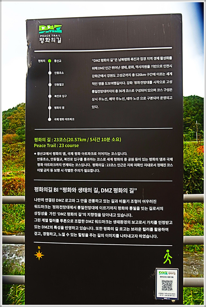 DMZ 평화의 길 화천 23코스는 풍산교에서 출발해 한묵령과 안동철교를 거쳐 평화의 댐 하부에 있는 국제평화아트파크까지 이어지는 20.6km의 도보길입니다. 이 코스는 민통선지역을 포함하고 있어 그간 통제구간이었으나 2025년 3월부터 민통선을 북쪽으로 3.5km이동시켜 그간 통행금지지역이었던 한묵령 북쪽으로 통행이 가능해져 이제는 안심하고 이용할 수 있게 되었습니다. 2년 전 강원도평화누리자전거길을 걸을 때만 해도 한묵령이북지역은 통행이 불가능해 대체코스로 해산령에서 비수구미계곡을 이용했던 기억이 떠오릅니다.