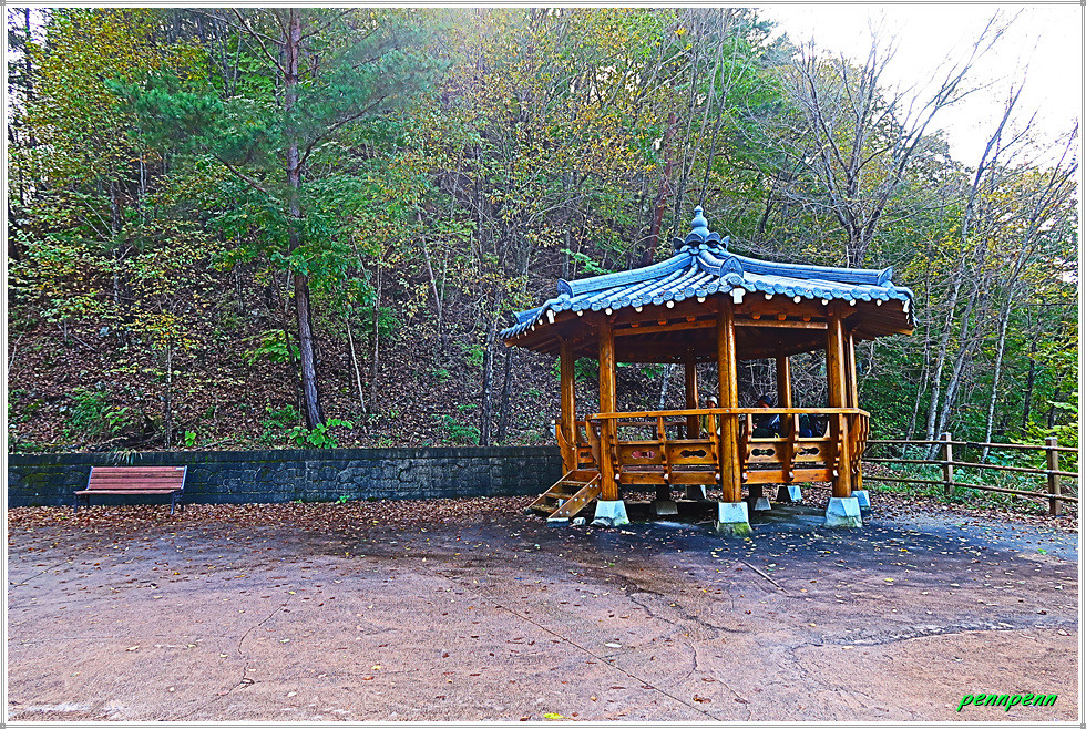 드디어 도로변 정자쉼터를 만나 간식을 먹으며 다리품을 쉽니다. 다시 걸으며 북한강이 잘 보일 때 “통일의 선봉장! 백두산에 태극기를!”이라는 구호가 적인 아취형 문을 통과하면 평화의 댐 경내입니다. 비목비석과 강원도 특유의 목판으로 만든 뾰족탑을 지나면 터널입구인데 이를 통과하면 바로 평화의 댐 하부 세계평화종공원으로 이어집니다. 따라서 이를 통과하지 말고 좌측으로 오르는 게 올바른 길 찾기입니다.