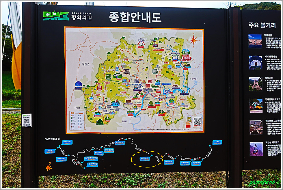 도로변에는 평화의 길 종합안내도와 Q인증코드가 있군요. 오늘 약 15km를 걷는데 4시간이 걸렸습니다. 출발지에서 한묵령까지 오르막길을 버스로 이동한 덕분에 무난하게 이 코스를 완주할 수 있었습니다. 길을 걸으며 분단의 현실을 뼈저리게 느꼈고 이 길을 걸을 수 있도록 허용해준 관계당국에 고마움을 전합니다. 주차장 높은 곳 염원의 종을 만나는 것은 보너스이겠지요.