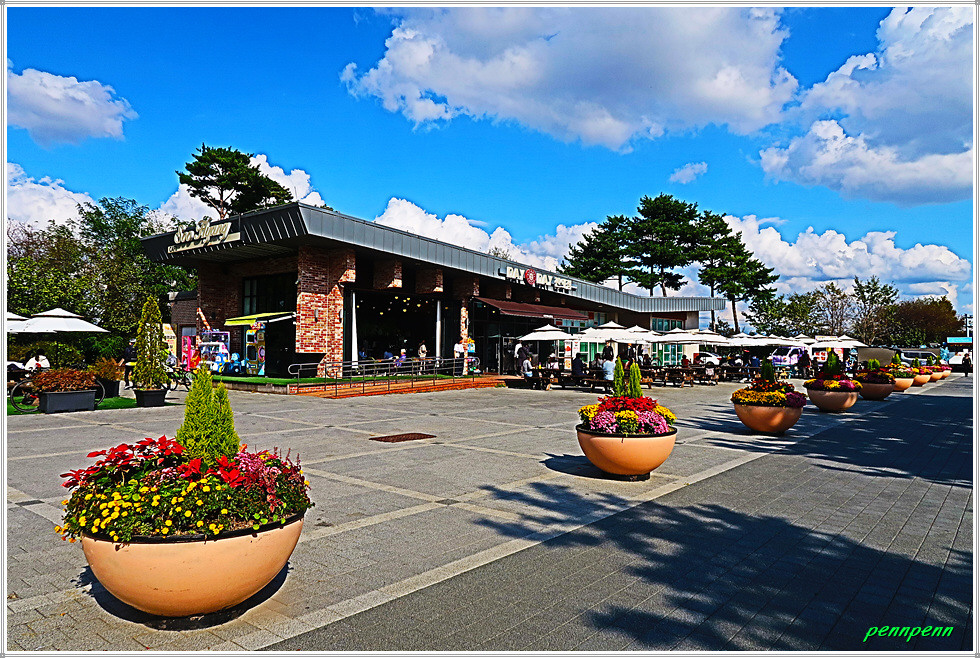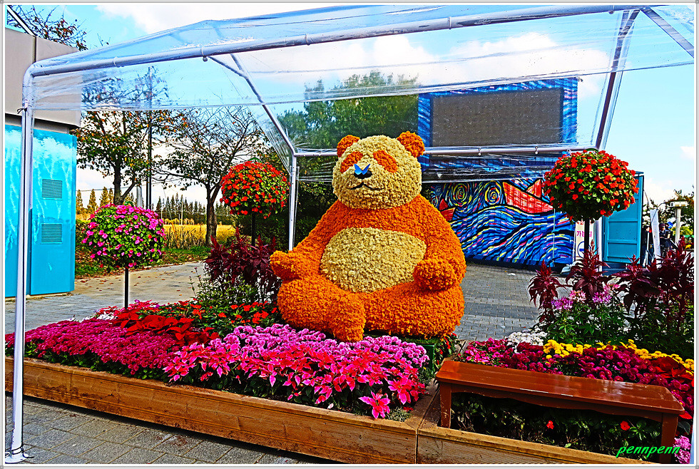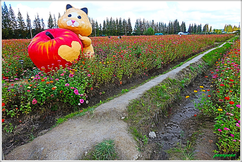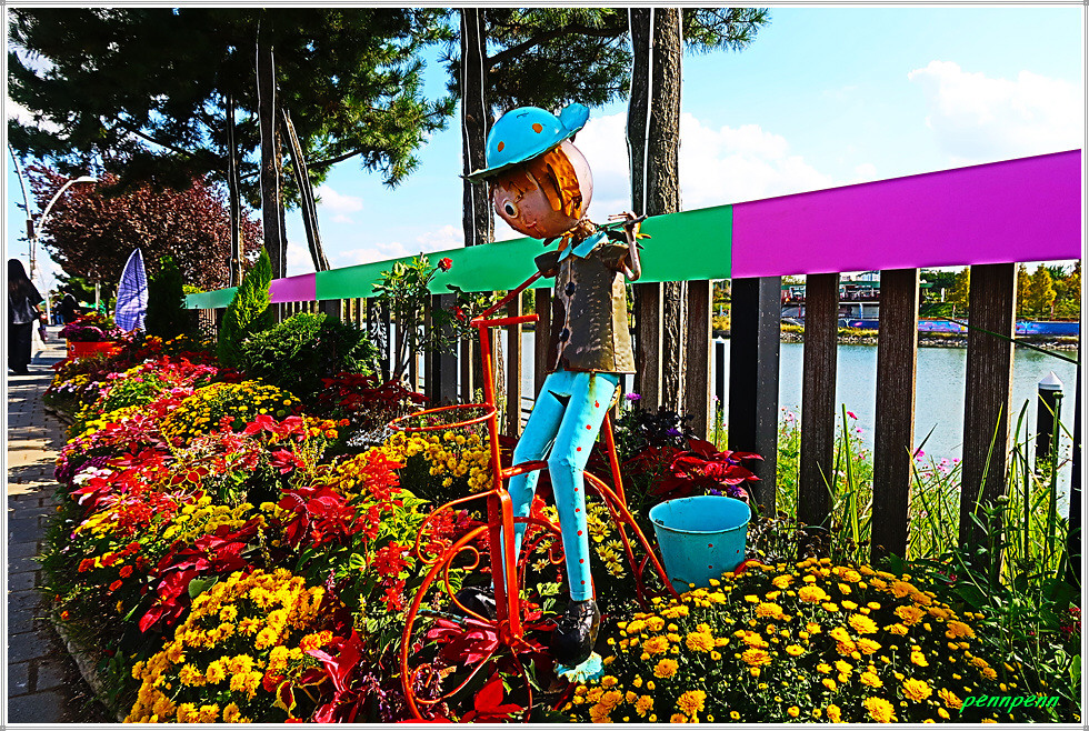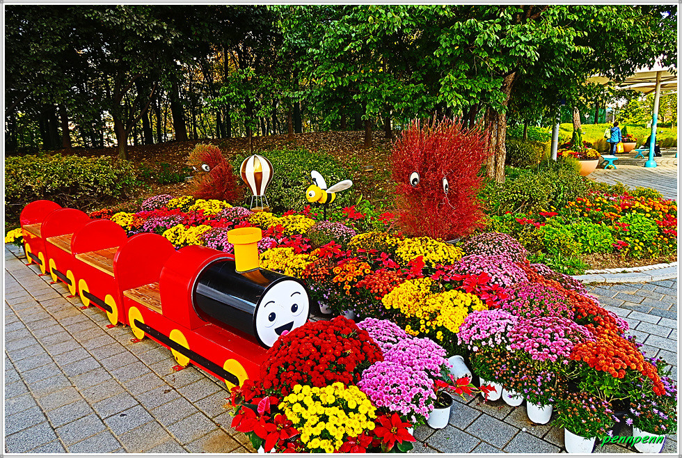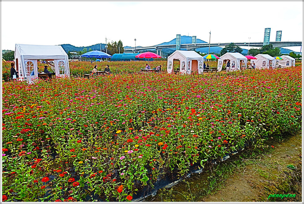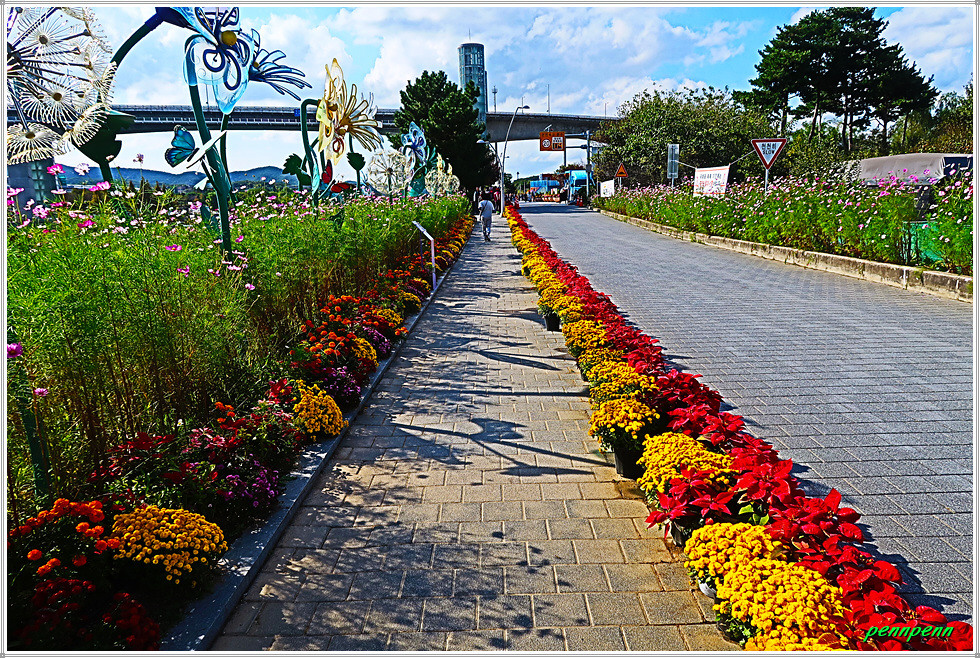 백일홍 군락지에는 자동차, 멍멍이와 사과, 해바라기, 하트, 반달, 해를 형상화한 다양한 조형물이 설치되어 있어 경내를 걸으면서도 지루하지가 않습니다. 특히 꽃밭 중앙에는 여러 채의 쉼터가 마련되어 있어 방문객들은 다리품을 쉬어갈 수 있습니다.(2025. 10. 23).