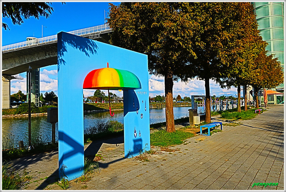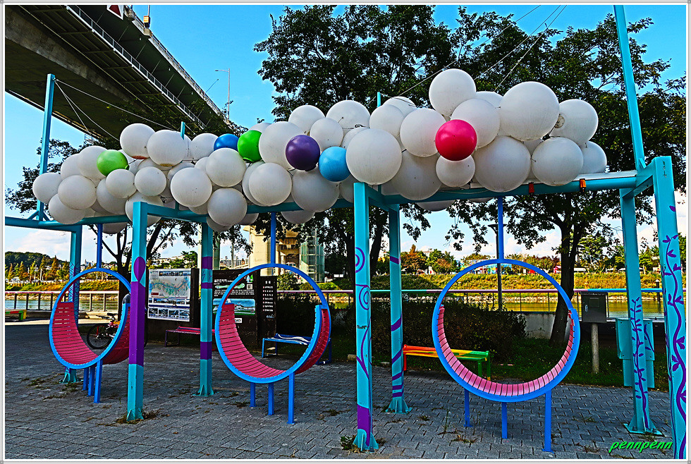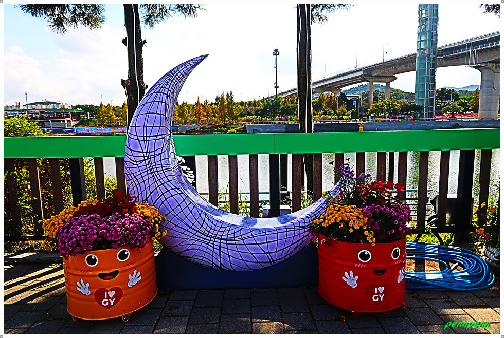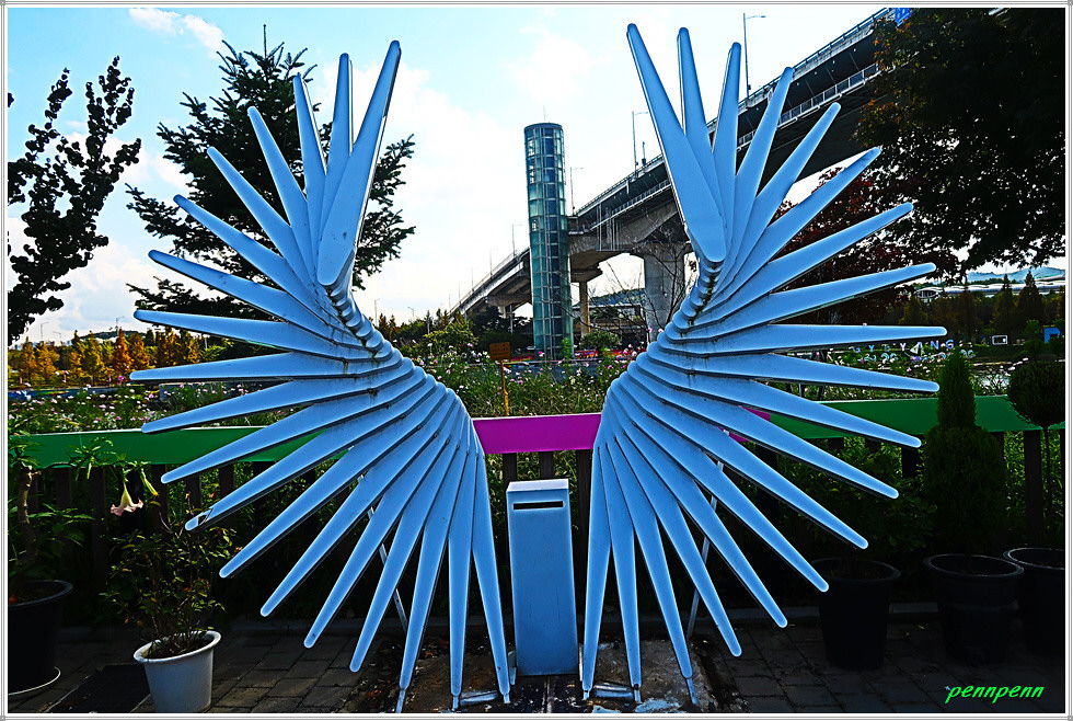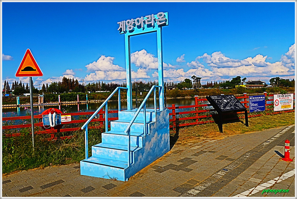 그런데 이쪽 계양대교 남단(귤현프라자)에도 사진을 찍을 만한 조형물이 있어 시간이 있을 경우 둘러보고 가는 게 좋습니다. 먼저 우측(동쪽)으로 가면 풍선과 흔들의자, 물대포 분수, 빛나는 나무, 무지개 의자, 3개의 하트, 계양 아라온을 알리는 천국의 계단, 인천아라벚꽃길 지도를 만나며, 아라뱃길 맞은편에는 수향원의 수양루를 볼 수 있습니다. 무엇보다도 여기서는 계양대교와 원통형의 엘리베이터가 잘 조망됩니다.