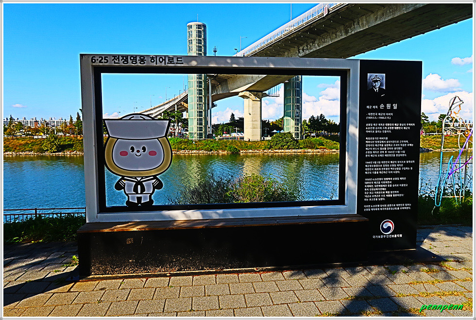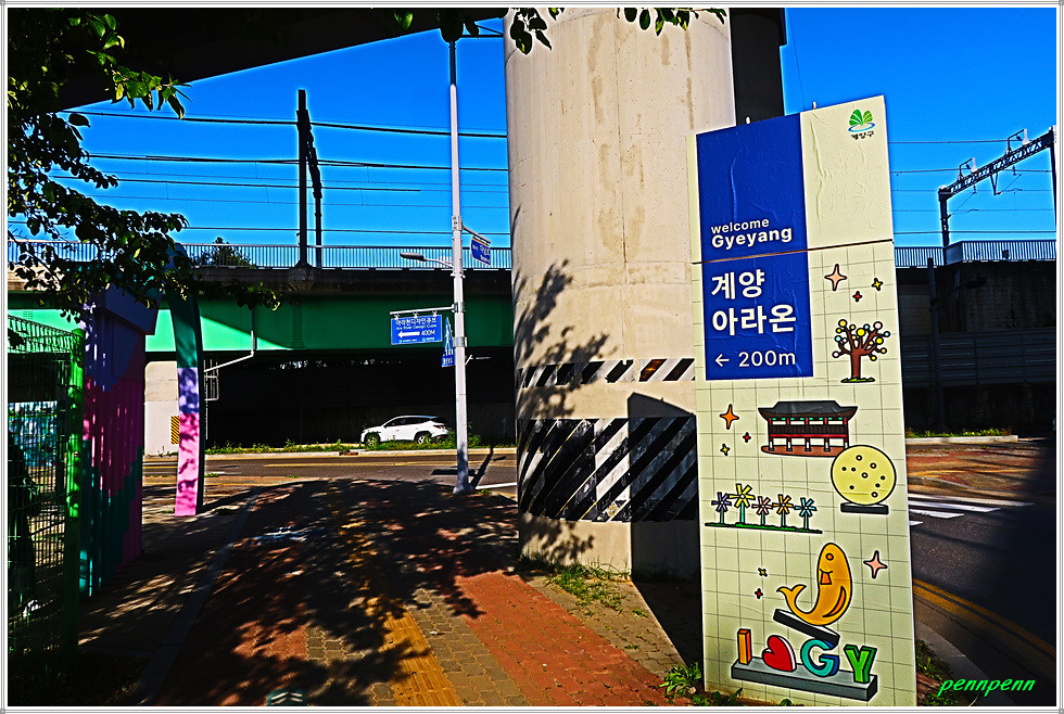 계양대교 하부에서 좌측(서쪽)으로 가면 거목이 있고 그 옆에는 계양을 알리는 영문글씨(GYEYANG), 6.25전쟁영웅 손원일 제독 안내문, 실제로 건반을 쳐 볼 수 있는 실로폰 레인보우 사운드(rainbow sound), 우산형상 조형물, 기념사진 촬영용 사각액자틀이 있습니다. 카카오지도를 보면 계양대교 북단 “계양 아라온”이라고 표기되어 있는데 계양대교 남단에도 계양 아라온이 있음을 알 수 있습니다.