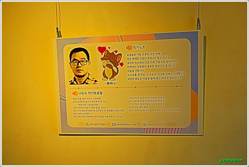 엘리베이터에서 내리니 광장에 계양 아라온 글씨가 있고 광장중앙에는 매우 큰 황금색잉어조형물이 놓여 있어 기념사진 모델이 되어 줍니다. 이외에도 곰돌이와 새 같은 조형물이 있어 사람들의 이목을 사로잡습니다. 아라갤러리에서는 최남숙 작가와 나진숙 작가의 작품을 전시중입니다.