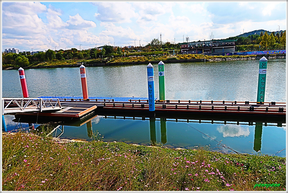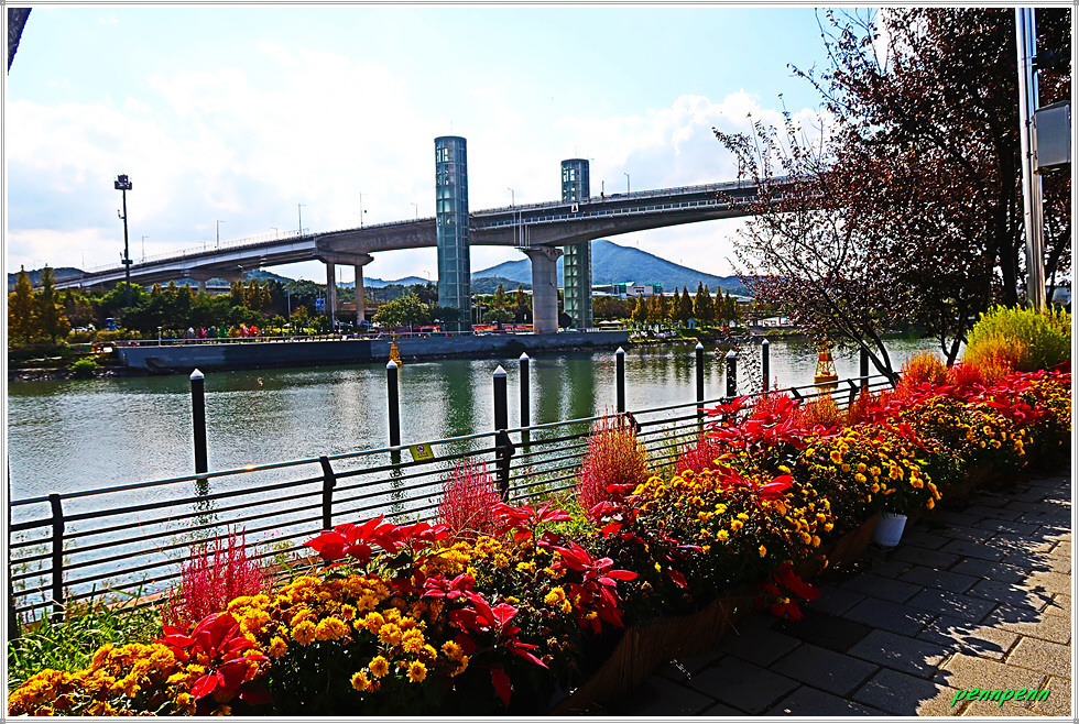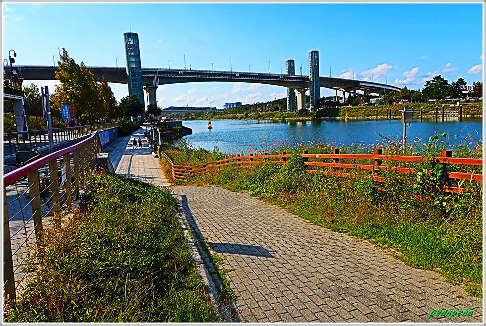이제 계양대교 남단에서 엘리베이터(우측)를 타고 2층으로 오로면 계양대교 상판아래 보행로가 개설되어 있어 편하게 다리를 건널 수 있으며 멋진 아라뱃길의 풍경을 조망할 수 있습니다. 계양대교 남단의 굴현프라자와 북단의 가을꽃축제가 열리는 수향원의 모습이 그림처럼 펼쳐집니다.