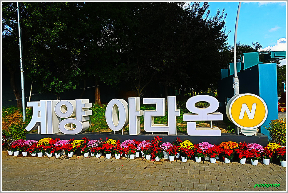 대중교통을 이용할 경우 인천지하철 1호선 계양역 또는 공항철도 계양역 1번출구(유일한 출구)로 나오면 길바닥에 “계양 아라온 가는 길”이 화살표로 표시되어 있어 길을 찾기는 여렵지 않습니다. 삼거리에서 좌측으로 가면 계양대교 교각 아래 “계양 아라온”이라는 큰 입체글씨가 세워져 있는데, 국화축제장으로 가려면 교각 좌우에 있는 초록색 원통형 엘리베이터를 이용하면 됩니다. 다만 좌측보다는 우측 엘리베이터를 이용하는 게 좀 편리합니다.