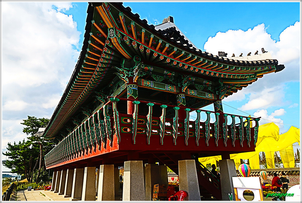 수향원 정문을 통과하면 해바라기 조형물과 원두막, 어린이 인형 등 다양한 방식으로 조성한 화단이 매우 정겨우면서도 화려합니다. 수향원의 중심건물인 수향루(水鄕樓)는 아라파크웨이에 있는 가장 큰 누각으로 앞면 7칸, 옆면 2칸 총14칸이며, 외형은 궁궐형식을 적용하여 웅장하고 격조가 높은 전통누각입니다. 지붕은 옆에서 볼 때 여덟팔자 모양을 한 팔작지붕이지요. 수향루에 오르면 주변풍광이 내려다보이며 인천에서 가장 높은 계양산(395m)도 잘 보입니다.