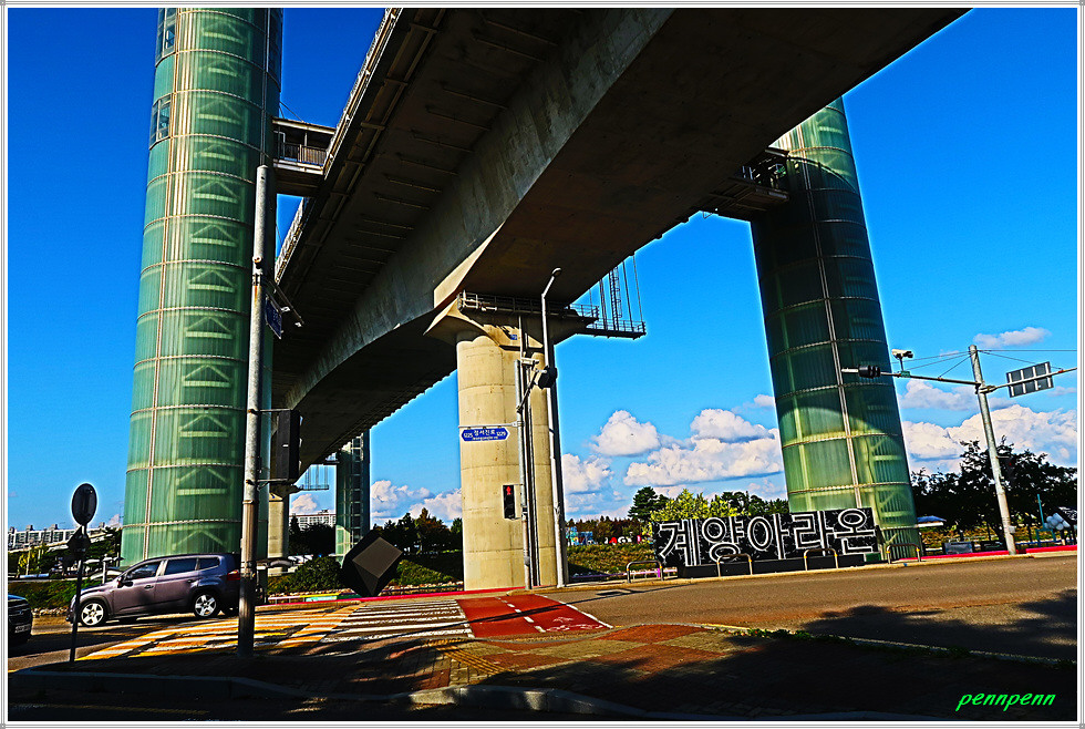 대중교통을 이용할 경우 인천지하철 1호선 계양역 또는 공항철도 계양역 1번출구(유일한 출구)로 나오면 길바닥에 “계양 아라온 가는 길”이 화살표로 표시되어 있어 길을 찾기는 여렵지 않습니다. 삼거리에서 좌측으로 가면 계양대교 교각 아래 “계양 아라온”이라는 큰 입체글씨가 세워져 있는데, 국화축제장으로 가려면 교각 좌우에 있는 초록색 원통형 엘리베이터를 이용하면 됩니다. 다만 좌측보다는 우측 엘리베이터를 이용하는 게 좀 편리합니다.