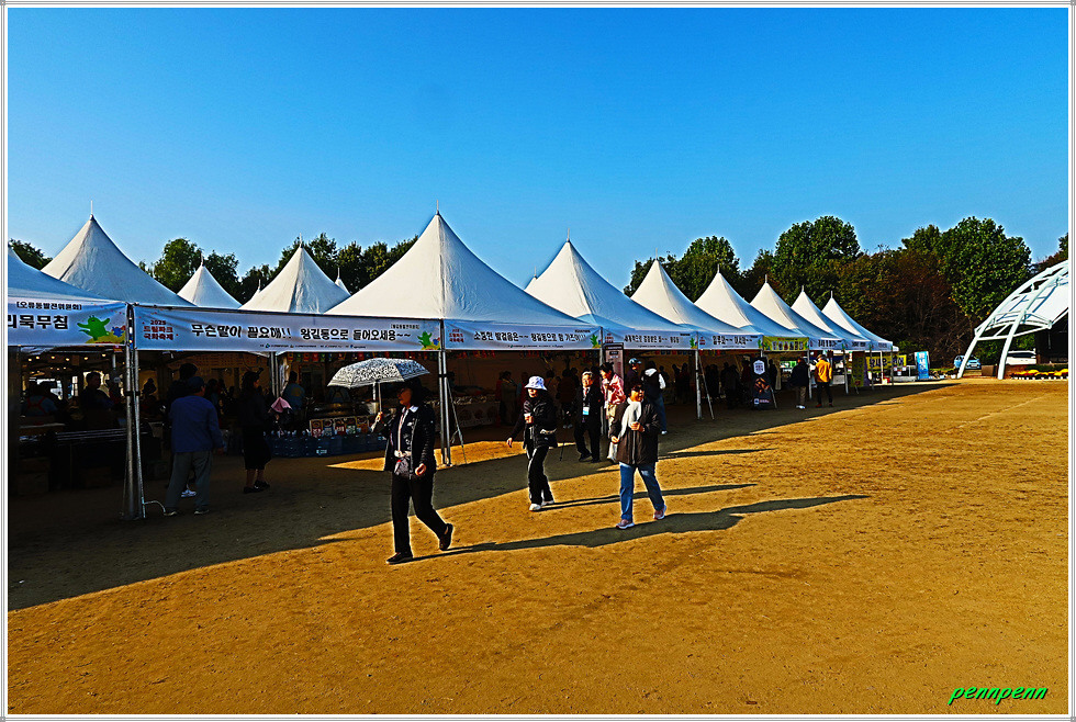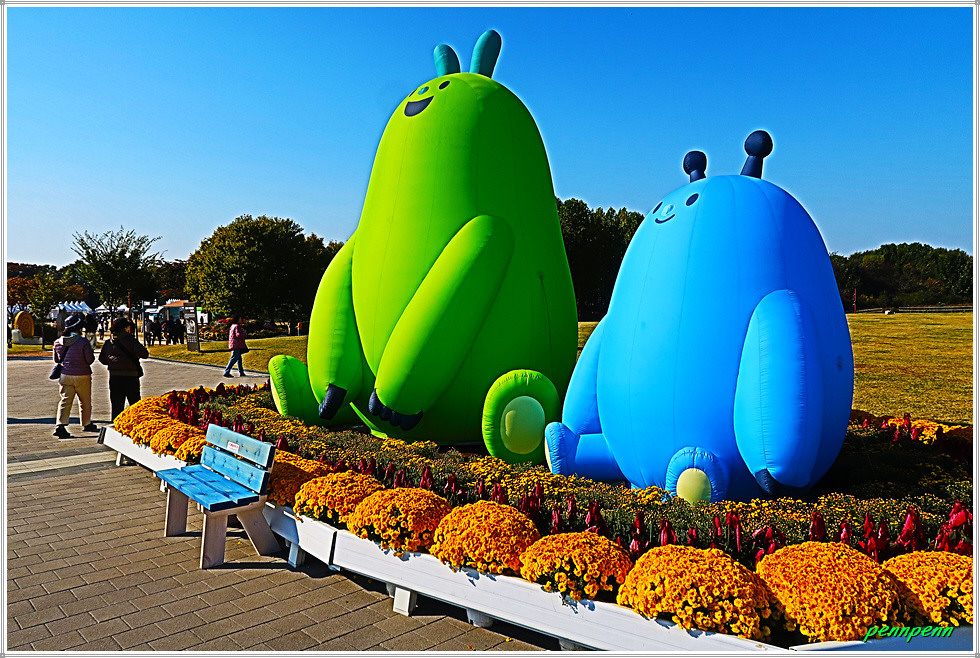 여기서 안쪽으로 조금 들어가면 대형광장인데 이곳에는 무대공연장, 먹거리 마당, 체험홍보프로그램 부스가 있습니다. 이곳 광장을 뒤로하고 서쪽으로 발걸음을 옮깁니다. 은행나무도 누렇게 물드는 가운데 데 아까 만났던 두 마리의 동물이 환영인사를 하네요. 악어조형물 뒤로 달팽이가 올라가 있는 아취형문이 반겨줍니다. 신랑각시로 분장한 모습도 보이는군요.
