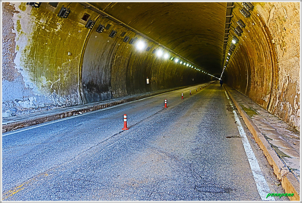 드디어 양구 오천터널입구입니다. 오천터널의 길이는 1,296m로 양방향으로 달리는 2차선도로가 개설되어 있습니다. 원래 DMZ 평화의 길은 여기서 좌측의 임도로 진입해 숲속을 요리조리 돌아 나와야 하지만 우리는 그냥 터널을 통과하기로 합니다. 터널 양쪽 끝에는 사람이 걸을 수 있는 곳이 있어 위험하지는 않지만 차량이 오갈 때 엄청난 터널 내 소음으로 귀가 멍멍할 정도였습니다. 터널은 일직선으로 되어있어 출구의 끝이 아스라이 보이더군요. 터널 우측에는 아까 숲으로 진입했을 경우 나오는 출구가 있습니다.