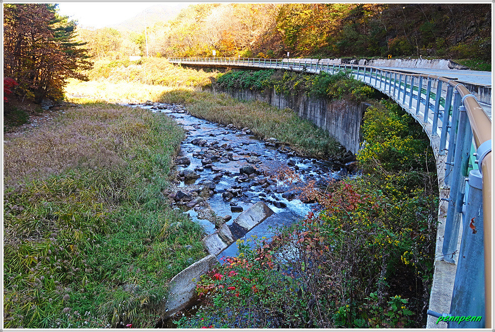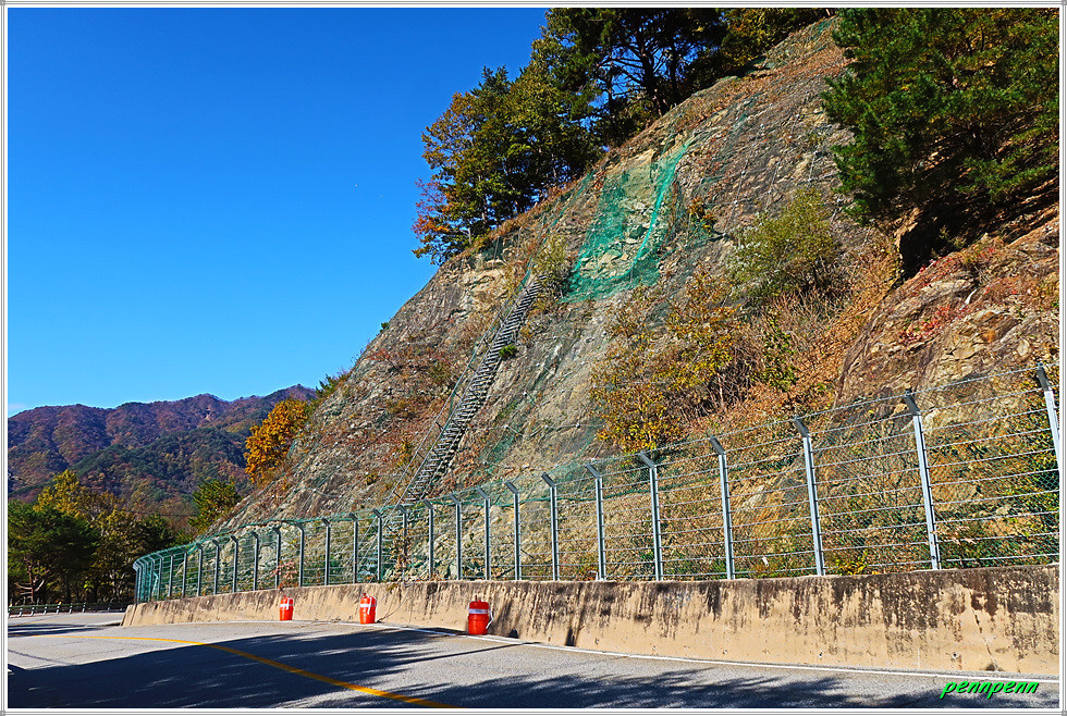 약초농원을 나와 길을 가면서 뒤돌아보니 조금 전 지나온 삼거리갈림길의 이정표가 서 있습니다. 길섶에는 모처럼 단풍이 보이는데 사실 금년 가을의 단풍은 늦더위 때문인지 제대로 물들지도 않은 채 시들어버린 듯합니다. 구부러진 길을 뒤로하고 새터교와 천미교를 지나갑니다. 도로변 공사안내문에는 “지방도 460호선 천미2지구 급경사지 붕괴위험지역 정비사업”을 한다고 되어 있습니다. 공사기간은 이미 9월에 끝난 것으로 적혀 있지만 아직도 일부 는 공사 중이었습니다.