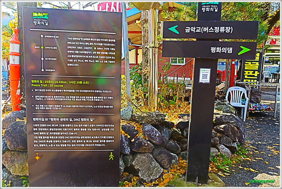 또 다른 양봉농원을 지나자 우측 숲에는 자작나무가 군락을 이루어 자라고 있습니다. 길섶에는 곤포 사일리지(가축 사료용 건초더미)가 여럿 놓여 있군요. 부지런히 발걸음을 옮기니 목적지인 양구군 방산면 오미리 소재 종점상회인데 그 좌측 공식 이정목에 QR인증코드가 부착되어 있습니다. 오늘 13km를 걷는데 약 4시간이 소요되었습니다. 원래 거리는 15.2km이지만 오천터널 통과로 거리가 단축된 것입니다. 사실 이 코스에는 출발지인 국제평화아트파크를 제외하고는 볼만한 명소가 전혀 없는 무미건조한 길입니다. 다만 화창한 가을 날씨로 양구 땅에서 가을을 오롯이 느낀 시간이었습니다.