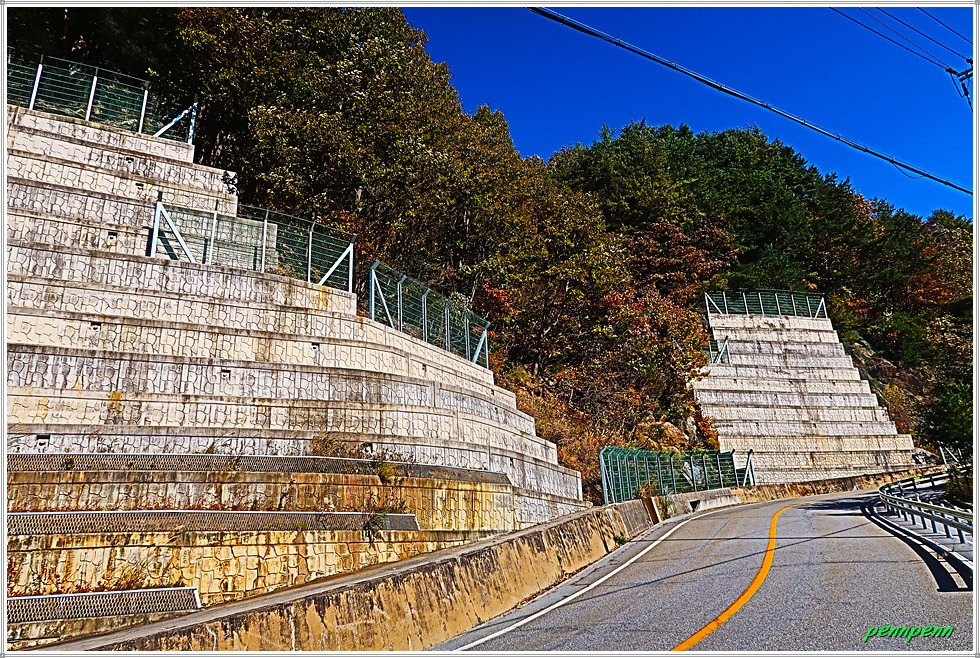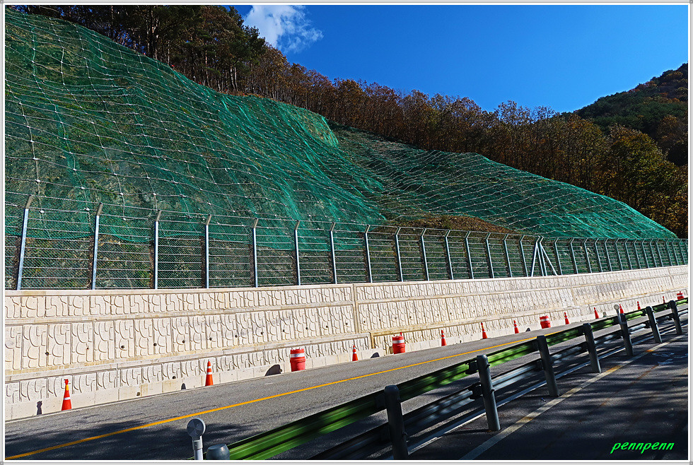도로는 점점 오르막으로 변하는데 군데군데 도로법면(道路法面, 도로를 건설하는 과정에서 흙을 쌓거나 깎아 내어 형성된 경사면)의 보수와 정비를 한 게 보여 도로를 개설하느라 매우 난공사를 했음을 알 수 있습니다.