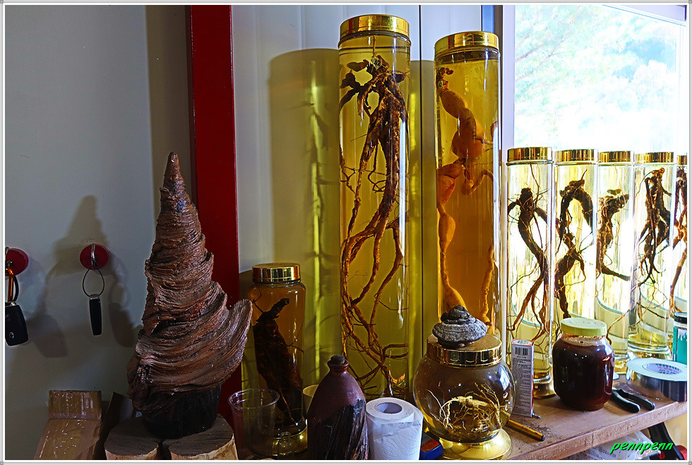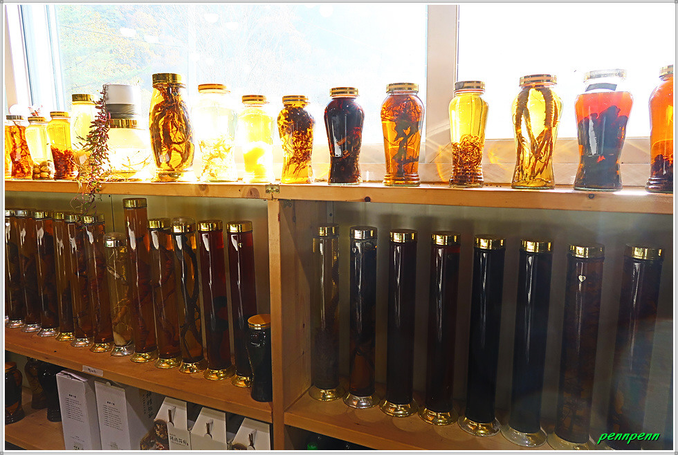 이 길은 그전 조성된 강원도 평화누리자전거길과 동일한 길이어서 도로변에는 자전거길이 잘 조성되어 있습니다. 칠천교를 지나니 좌측에 천미리약초농원(영희다방)이 있는데 건물에는 영희다방(CAFE)이라는 간판이 붙어 있어 차 한 잔 마시려 안으로 들어갔습니다. 그런데 현대식으로 깔끔하게 내부인테리어가 된 카페에는 각종 약초와 곤충으로 담근 술이 엄청 많이 진열되어 있어 약초농원이라는 상호가 실감납니다. 약초로 담근 술의 가격은 가장 저렴한 게 10만 원 선이라고 하는데 실제 흥정이 되는지의 여부는 잘 모르겠습니다. 농원입구에는 생수를 마실 수 있도록 바가지를 걸어두었군요.