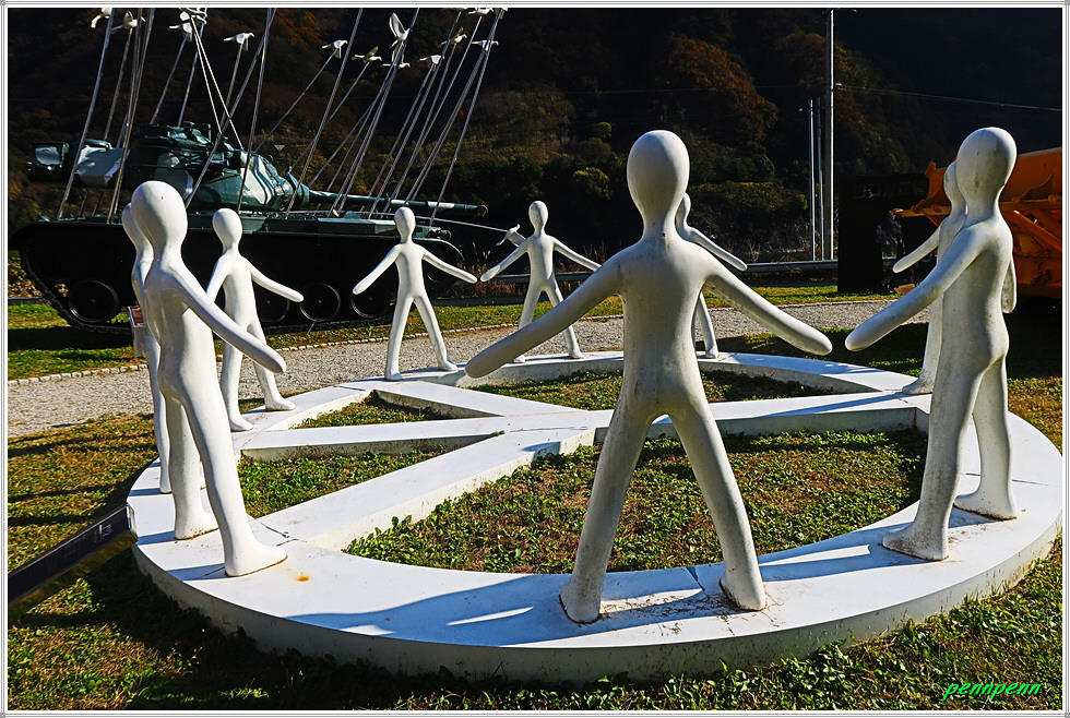 “대화의 나팔”은 전쟁은 곧 상대방과 대화를 거절한다는 것으로 너와 내가 평화롭기 위해서는 서로를 받아들이는 마음으로 대화의 문을 열어야하며, 귀를 기우려보면 평화의 메시지가 들릴 것입니다. “손에 손잡고”는 커다란 평화마크 위에 군데군데 배치한 사람모양 청동인형을 연출하여 관람객이 인형의 손을 잡으면 둥근 모양의 평화의 심벌이 완성됩니다. 너와 내가 등지지 않고 서로를 바라보며 서로를 아껴주는 행복한 세상을 만들자는 의미가 담겨 있습니다.