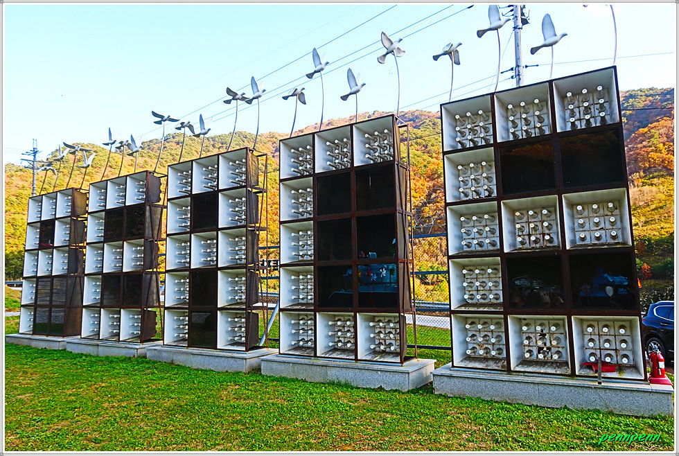 “DMZ”라는 작품에도 국제평화아트파크 글씨를 붙여 놓았군요. 우리나라는 전 세계 유일의 분단국으로서 이 작품은 155마일 휴전선 일부를 그대로 재현한 것입니다. DMZ의 역사성과 상징성을 표현하며 색색의 기원을 담은 리본들이 철조망에 있는 한 평화는 지속될 것입니다. 철조망 뒷면의 작품은 “평화의 함성”입니다. 냉전과 대립의 상징물인 대북방송장비를 조각이 보여주는 형태적인 안전감을 통해 평화라는 문자의 메시지를 직접적으로 전달하는 조형물입니다.