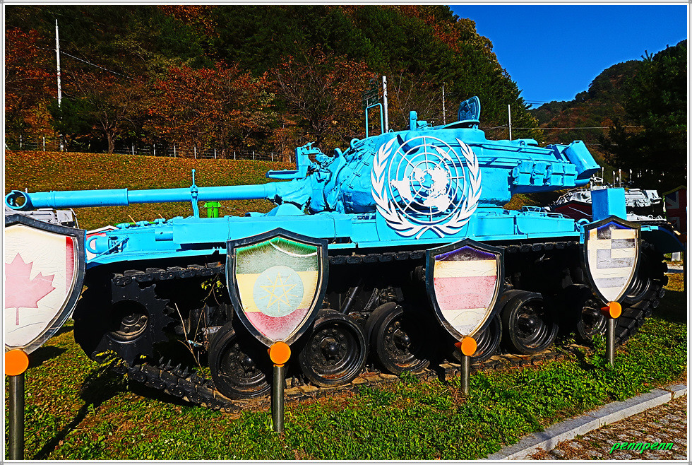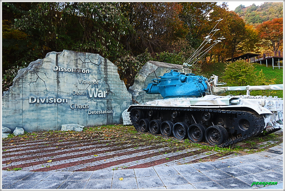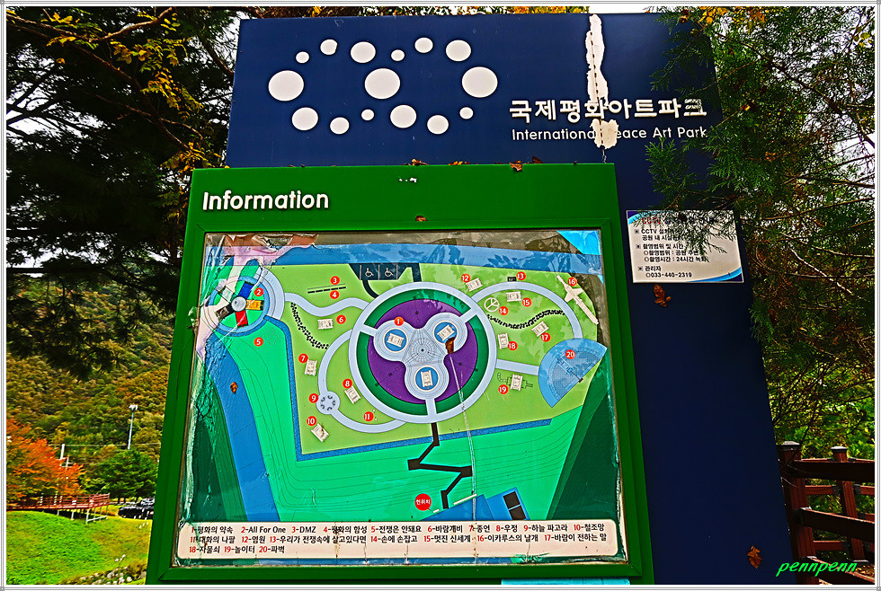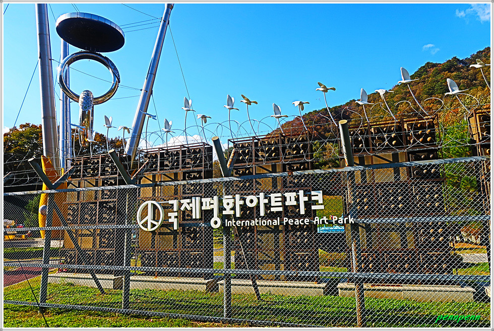 규모가 큰 주차장에는 국제평화아트파크를 알리는 입체글씨가 세워져 있는데 전망대에서 내려다보면 아트파크를 대표하는 조형물인 “평화의 약속”이 공원(파크) 중심부에 우뚝 서 있습니다. “3개의 포신은 자유와 평화 및 사랑을, 천상의 별자리는 아름다운 세상을, 두 개의 반지는 다음 세대와 영원한 평화의 약속을, 기둥아래 장식은 자라나는 평화의 새싹을, 흰색탱크는 평화수호자로서의 역할을 상징합니다.”