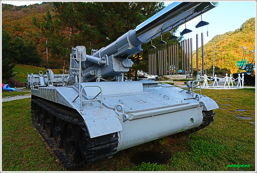 “바람이 전하는 말”은 강바람의 세기에 따라 때론 은은한 평화의 메시지로, 때론 절박한 자명고 소리로 아트파크에 울려 퍼집니다. 자주포신의 윈드벨에서 퍼지는 평화의 선율이 님의 가슴에 메아리쳐 들립니다. “파벽”은 전쟁의 무기가 아닌 평화의 견인차로서 분단의 벽을 무너뜨리는 새 역할을 수행하는 탱크를 통해 “no more war"의 메시지를 전달합니다.