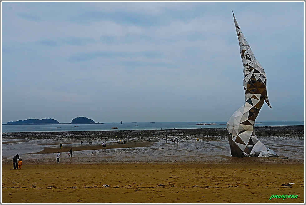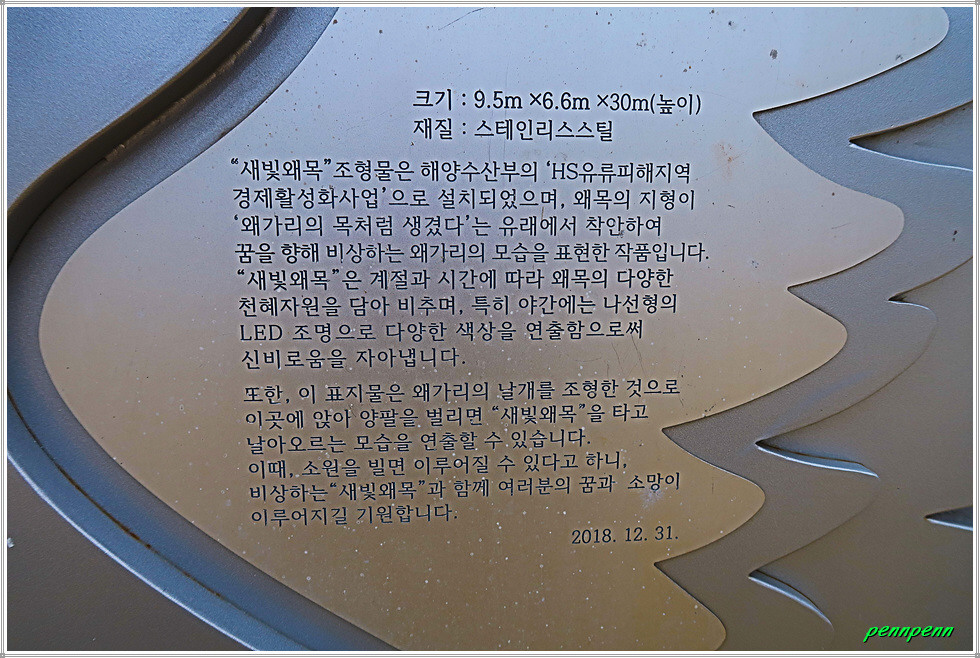 해변가로 가면 제일 먼저 방문객을 환영해주는 것은 하트조형물입니다. 해 뜨고 지는 왜목마을이라는 문구가 적혀 있군요. 하트조형물 뒤로 보이는 새 머리형상의 작품이 더욱 눈길을 끕니다. 바다 쪽으로 나가면 “새빛왜목”작품 설명서가 있는데 높이가 9.5m에 달하는 이 조형물은 “왜목의 지형이 왜가리의 목처럼 생겼다”는 유래에서 착안해 꿈을 향해 비상하는 왜가리의 모습을 표현한 작품입니다.