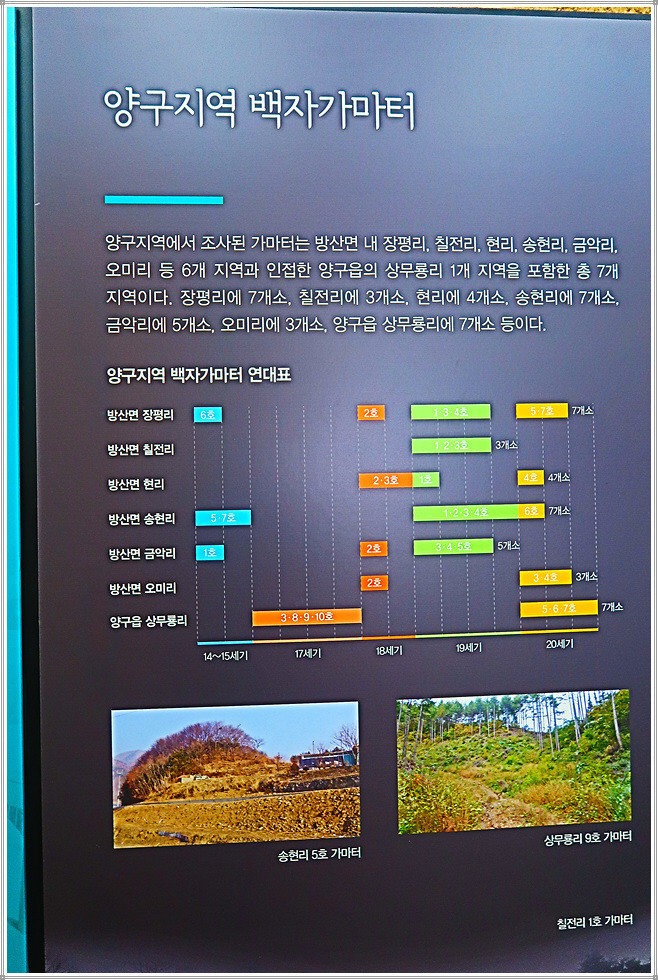 양구군 방산면 일대 도요지 지표조사 결과 40기의 가마터가 확인되었으며 그 지역은 양구군내 방산면 소속의 장평리, 칠전리, 현리, 송현리, 오미리, 금악리 등 6개 지역과 인접한 양구읍의 상무룡리 1개 지역을 포함한 총 7개 지역입니다. 가마터의 수를 보면 장평리 7기, 칠전리 5기, 현리 4기, 송현리 7기, 금악리 4기, 오미리 4기, 상무룡리 9기 등 총 40기가 확인되었고 약 7개 지역에서 백자를 제작할 때 사용했을 것으로 추정되는 원료를 확인하였습니다.