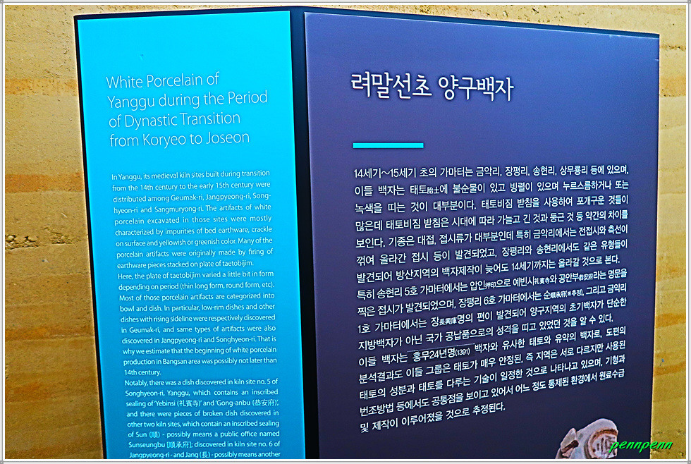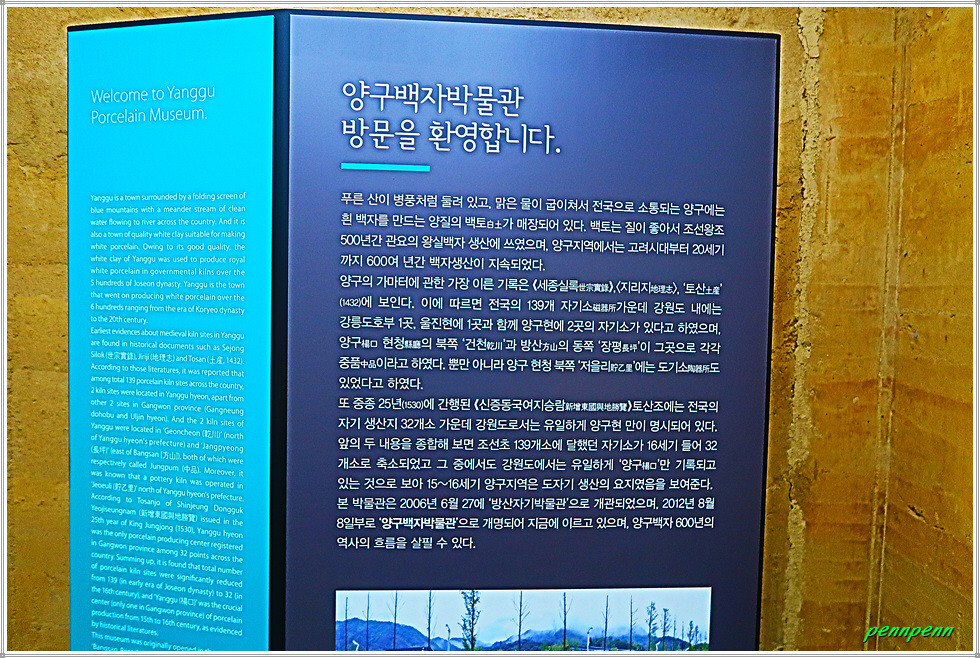 양구백자실은 양구지역의 백자가 전시된 130여 평 규모의 공간으로 이성계 발원백자, 고려말 조선초 양구백자, 조선중후기 양구백자, 양구지역 백자가마터, 전설로 본 백토 관련 백자와 자료를 볼 수 있는데 이를 사진으로 소개합니다. 양구군 방산면 일원은 조선백자의 시원지(始原地)로 알려진 지역입니다. 1932년 금강산 방화선(防火線) 공사 때에 금강산 일출봉 석함(石函)에서 조선을 건국한 태조 이성계의 발원문이 써진 백자류가 발견되었는데, 백자대발의 음각된 글씨 중 방산사기장(方山沙器匠) 심용(沈竜)이라 는 구절을 통해 이들 백자의 생산지가 양구 방산임을 알 수 있습니다.