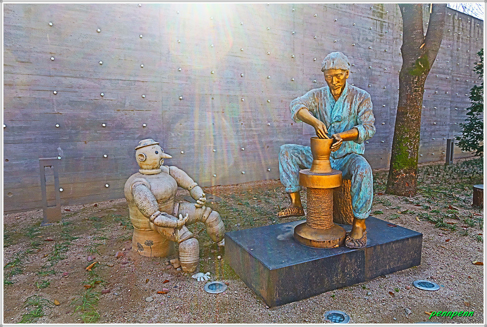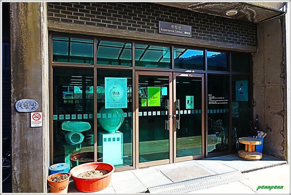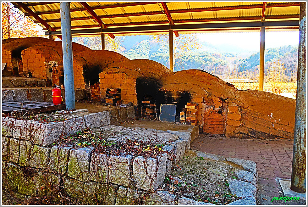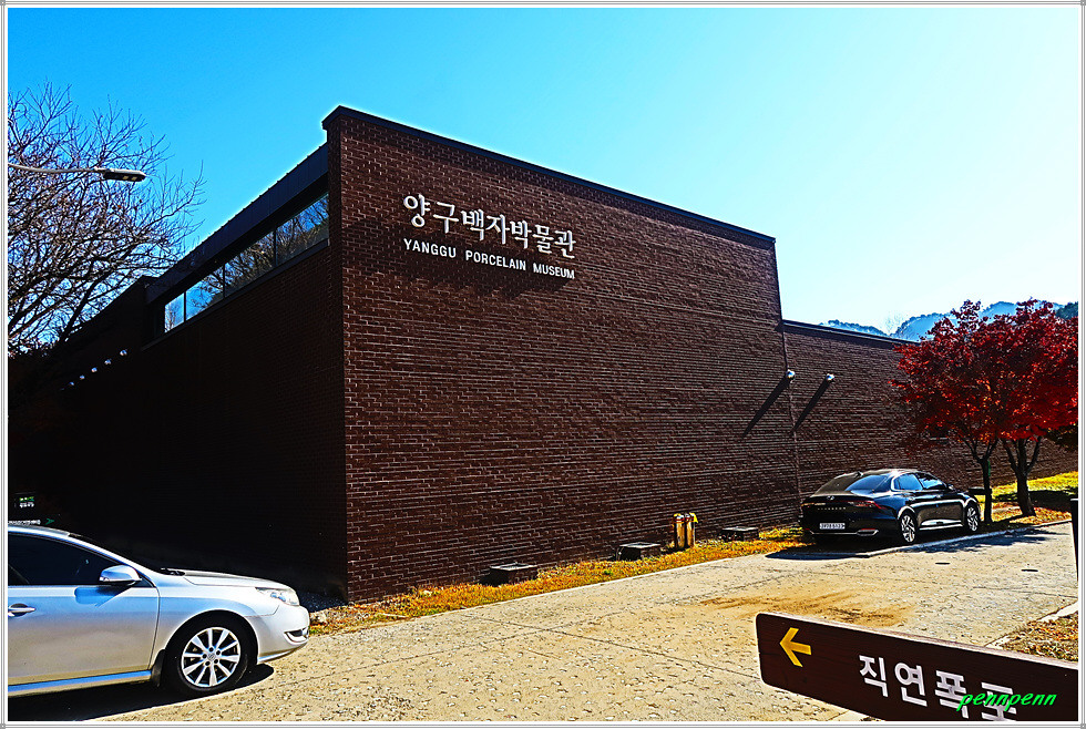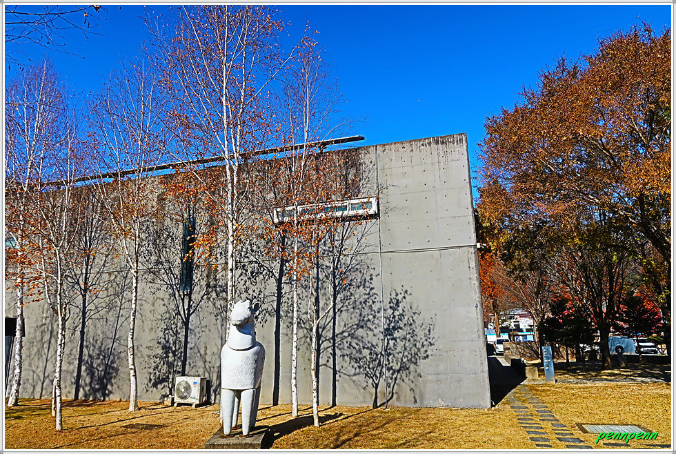 때는 늦은 가을이지만 박물관 입구에는 화려한 단풍이 남아 있어 방문객을 즐겁게 만듭니다. 주차장 쪽에는 도공의 조형물이 세워져 있고, 경내에는 도자기 체험관과 전통 가마도 있는데 엄청나게 쌓아둔 땔감이 가마에 얼마나 목재땔감이 필요한 지 짐작합니다. 수입천 쪽으로 가면 백자공원인데 여기에 백자카페가 있습니다.