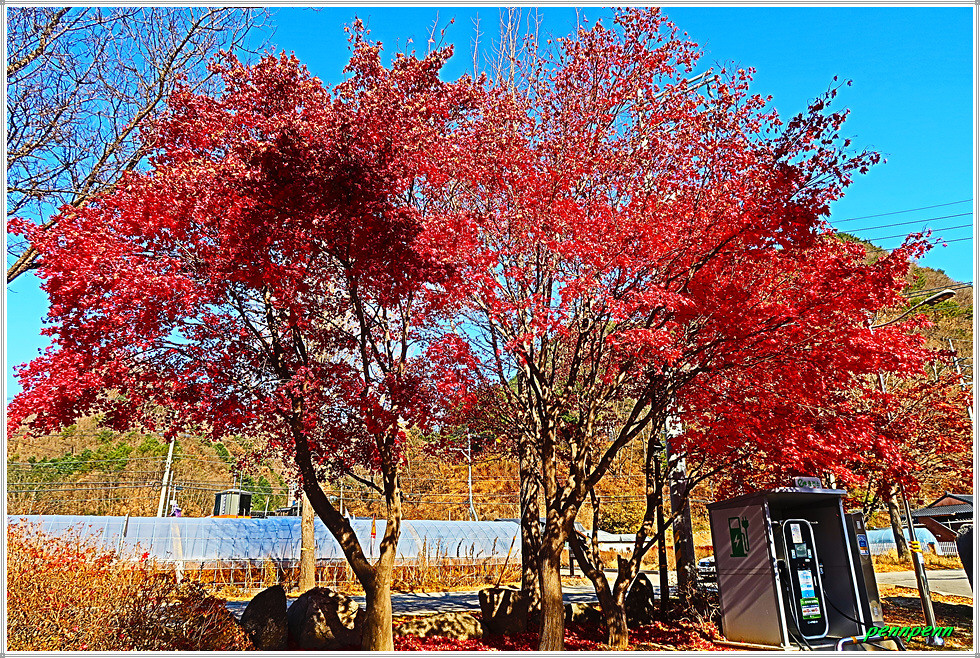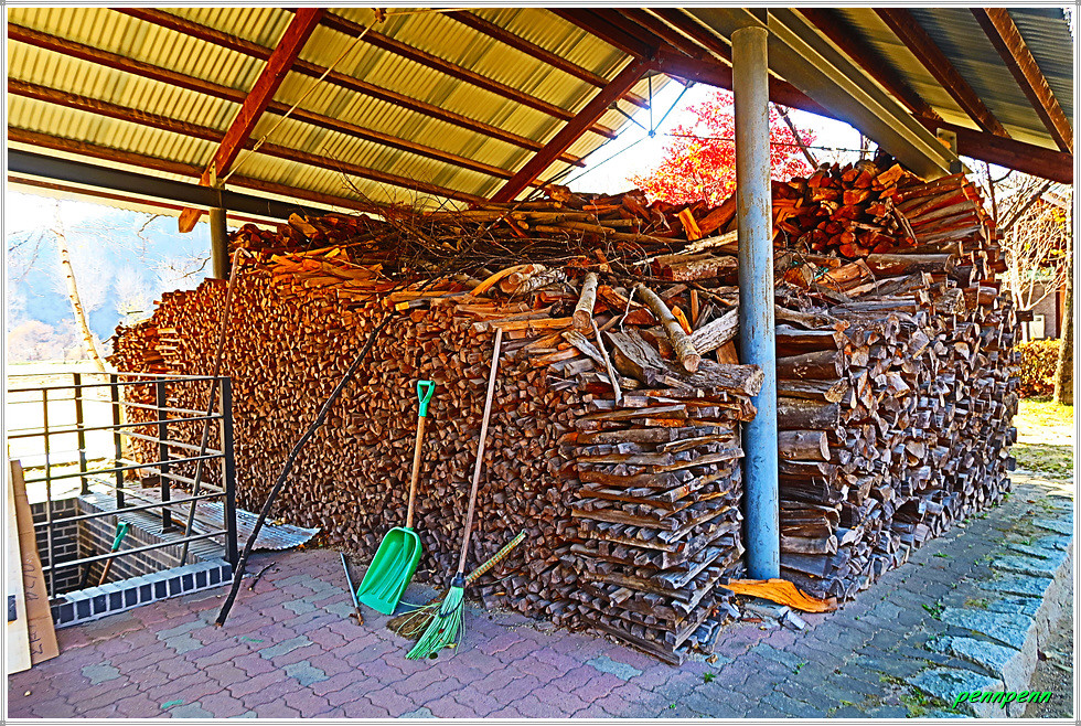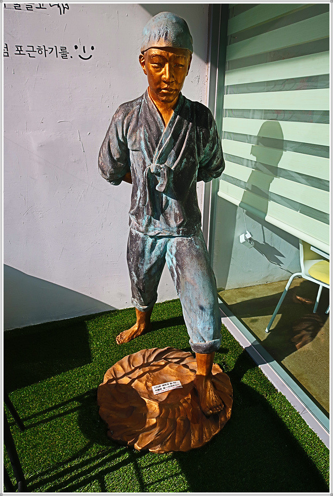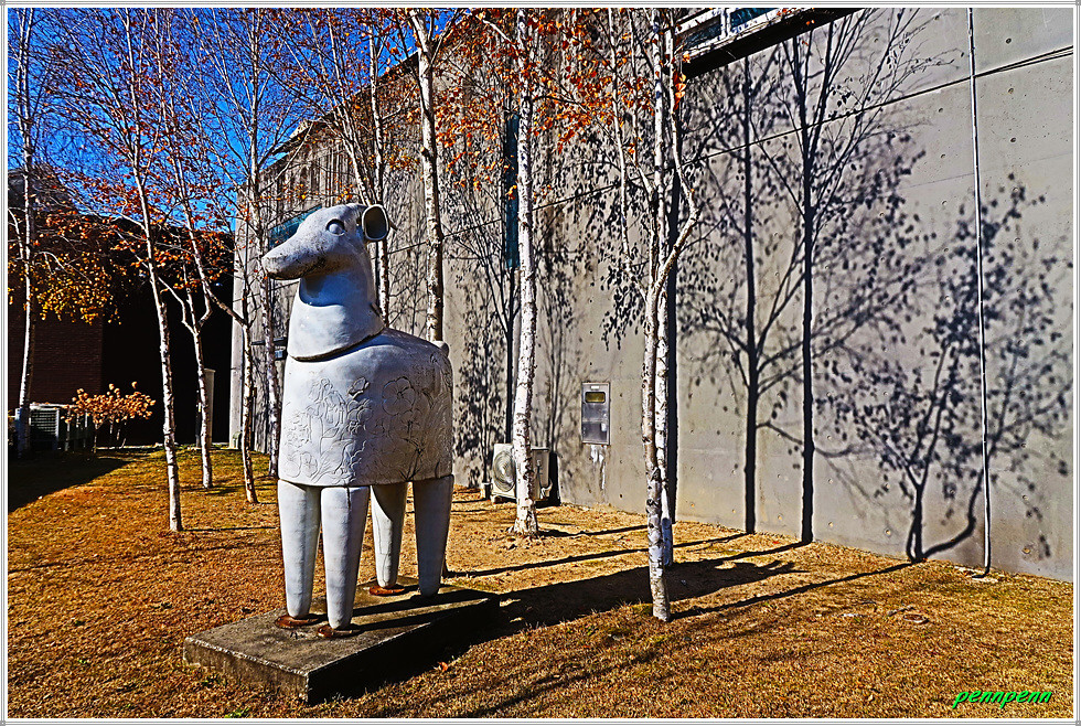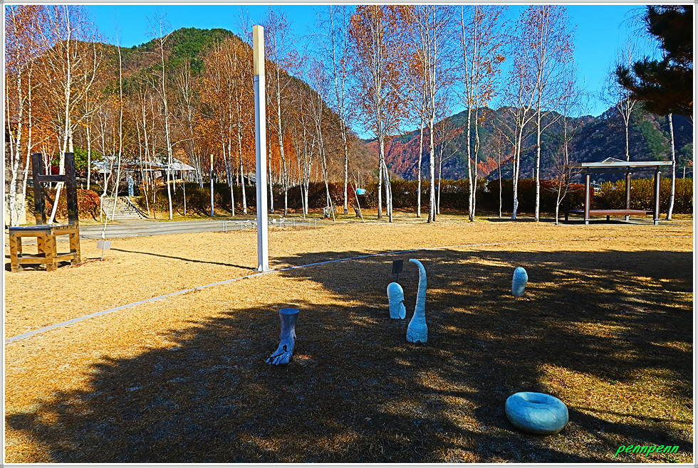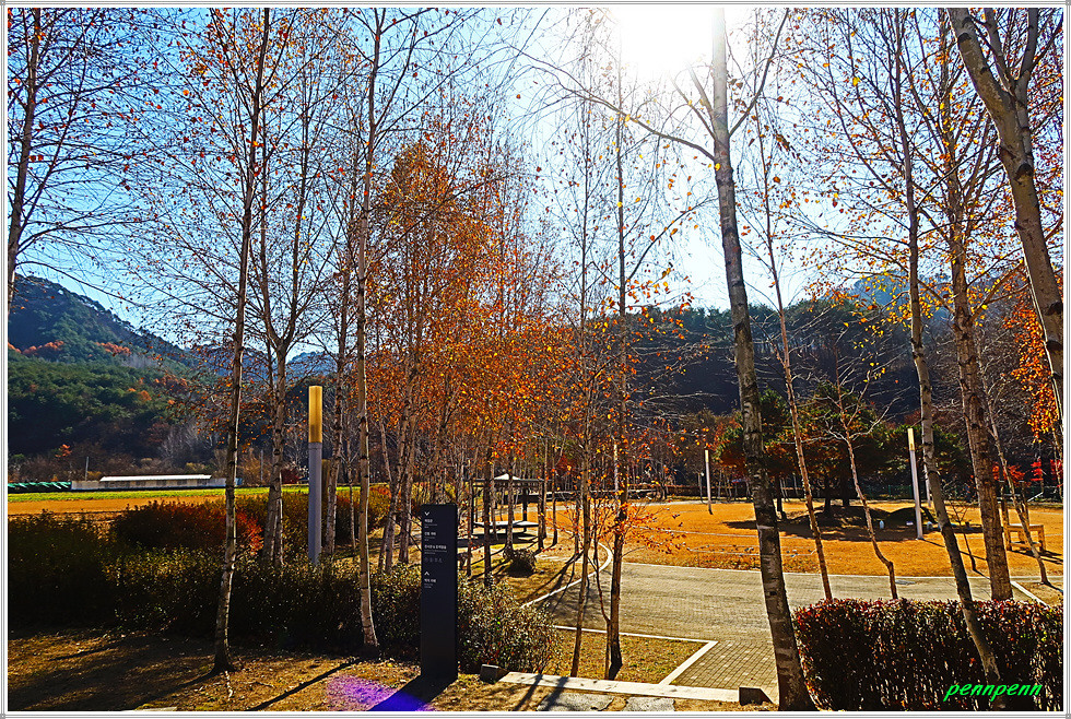때는 늦은 가을이지만 박물관 입구에는 화려한 단풍이 남아 있어 방문객을 즐겁게 만듭니다. 주차장 쪽에는 도공의 조형물이 세워져 있고, 경내에는 도자기 체험관과 전통 가마도 있는데 엄청나게 쌓아둔 땔감이 가마에 얼마나 목재땔감이 필요한 지 짐작합니다. 수입천 쪽으로 가면 백자공원인데 여기에 백자카페가 있습니다.