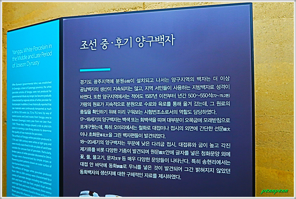 이제 박물관으로 들어갑니다. 양구백자실은 박물관의 소장 작품들 전시로 양구지역의 백자를 살펴 볼 수 있고, 다양한 영상물을 통하여 양구 지역 백자의 흐름을 알 수 있습니다. 기획전시실은 전시준비 중으로 출입금지였고, 현대적인 작품은 현대백자실에서 만날 수 있으며, 수장고에서는 박물관 소장 도예작품을 모두 볼 수 있습니다.