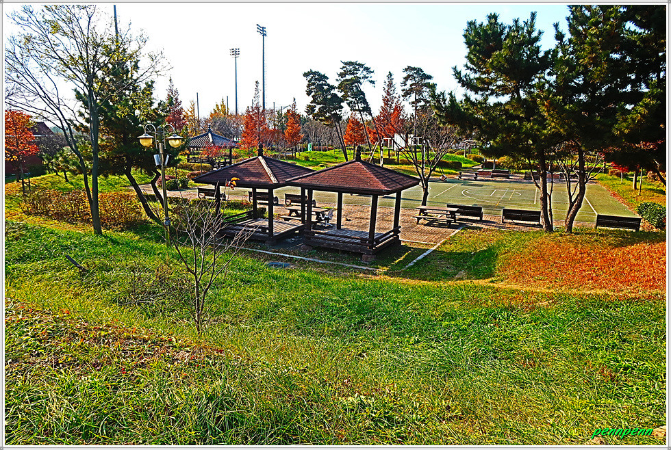 이제부터는 633번 지방도로(석문방조제로, 현대제철로)를 따라 남쪽으로 가야합니다. 우측 녹지에는 공원과 야구장이 조성되어 있군요. 좌측의 드넓은 부지에는 현대제철이 입주해 있습니다. 이상기온 탓인지 5-6월에 피는 장미가 11월 하순인데도 꽃을 피우고 있군요. 가곡교차로를 지나가는데 현대제철 공장이 보입니다. 현대오일뱅크 주유소가 있는 가곡1교차로, 당진엠코타운아파트가 있는 유곡1교차로를 지나면 목적지인 유곡2교차로에 서해랑길 82코스 안내지도가 있습니다.