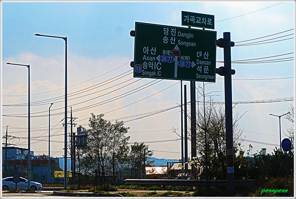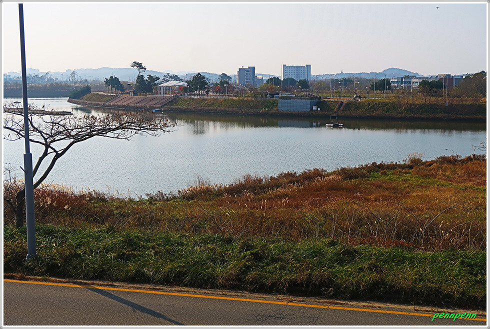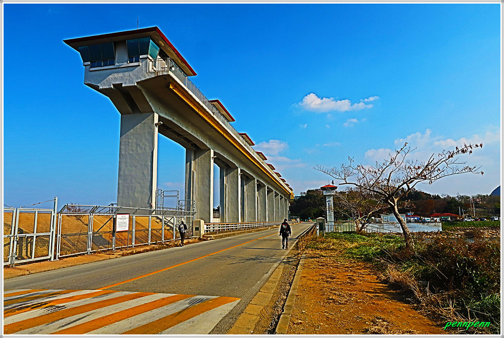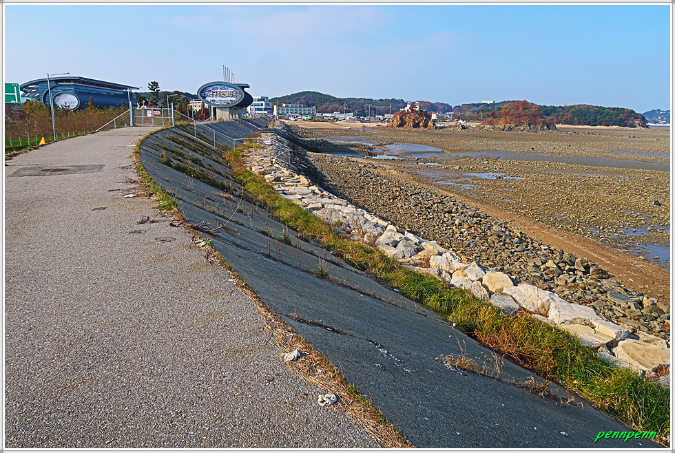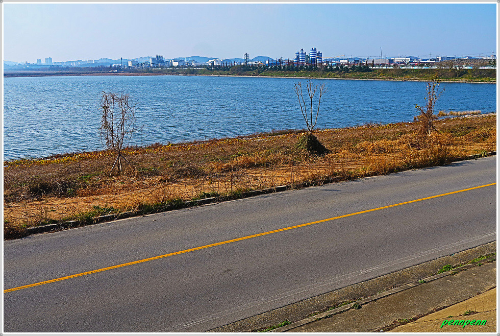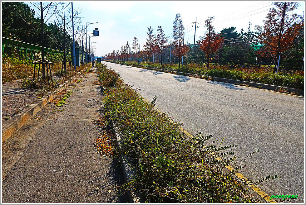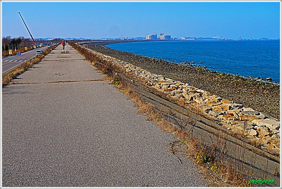 오늘 17km를 걷는데 4시간 20분이 소요되었습니다. 늦가을 날씨치고는 비교적 포근(낮 최고기온 섭씨 13도)하였고 바람도 불지 않아 여건은 좋았습니다. 그러나 오늘 길은 전부 방조제와 딱딱한 도로로 포장된 길이어서 발바닥으로 느끼는 감촉이 불편하였고 보이는 것이라고는 방조제 바깥쪽의 망망대해와 방조제 안쪽의 공사현장, 도로변의 공장지대 뿐이어서 상당히 무미건조했습니다. 이런 코스를 설계할 때는 현지 여건 상 어쩔 수 없는 경우가 있을 테지만 가급적 걷는 이들의 마음도 헤아려주기를 기대합니다.