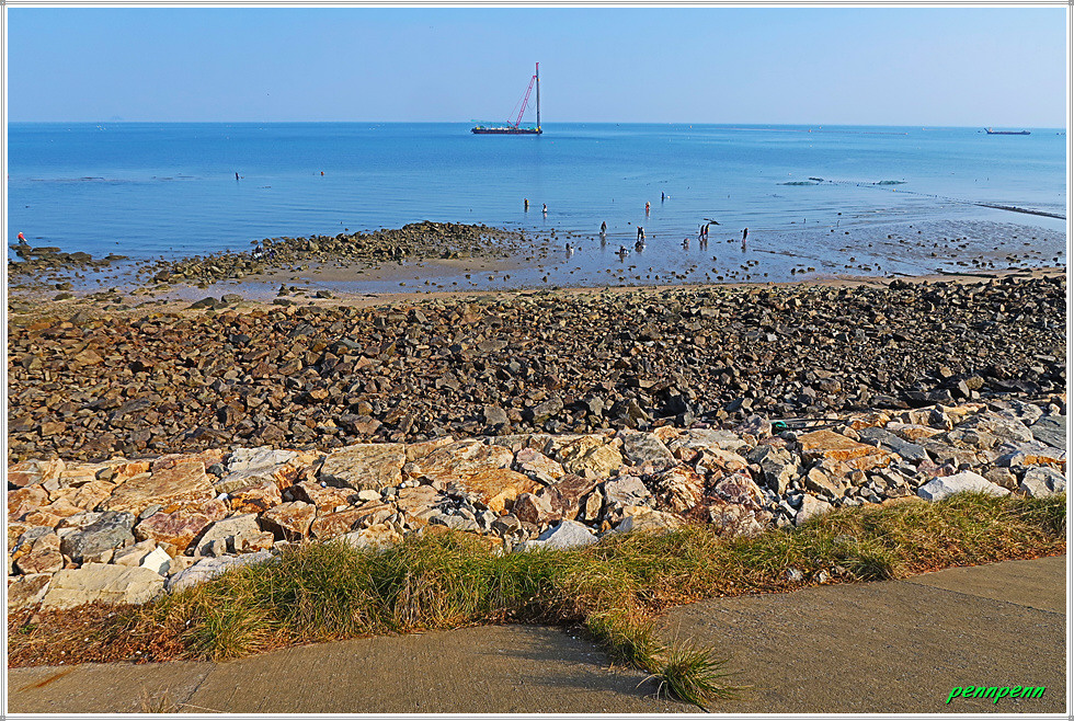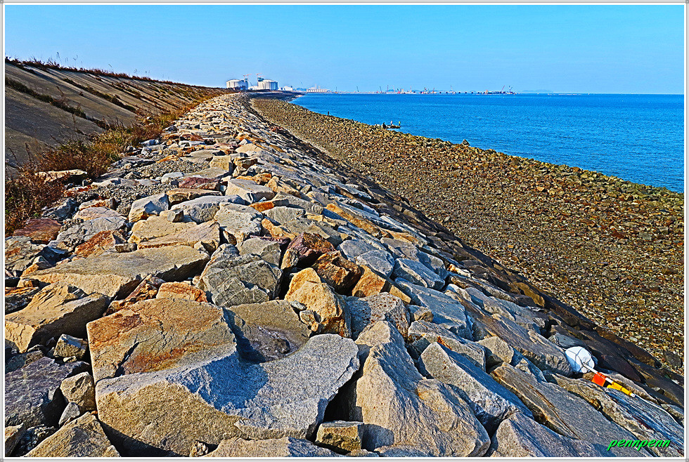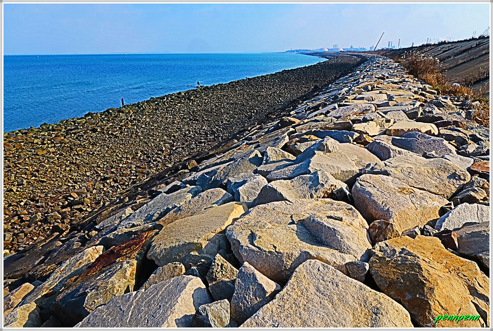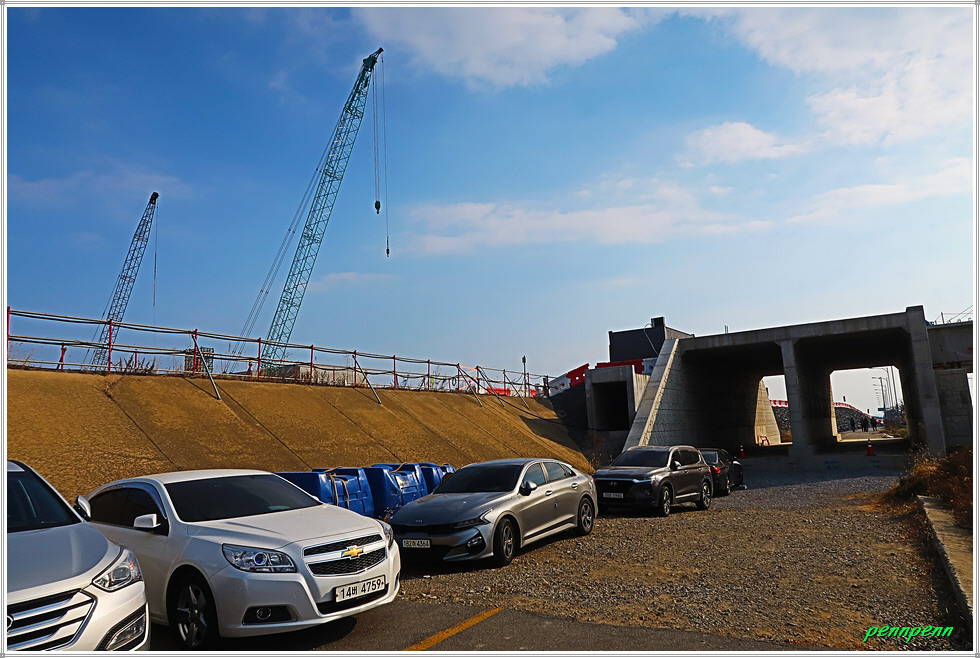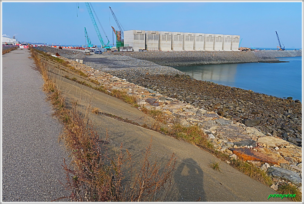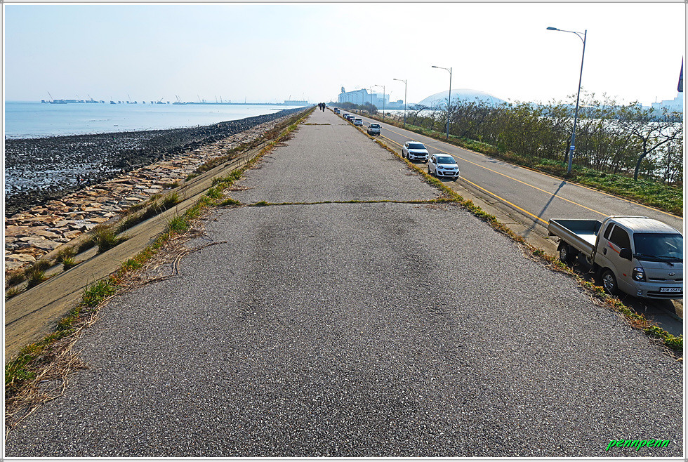 방조제의 길이가 10km에 이르고 보니 가야할 방향의 방조제의 끝이 보이지 않을 정도로 아득합니다. 방조제 바깥쪽의 갯벌에는 어부들이 어로작업을 하고 있는데 무엇을 잡는지 잘 모르겠습니다. 방조제 안쪽에는 거대한 규모의 돔 형식의 시설물이 보여 공장인지 물류장고인지 의아해하다가 현지인에게 물어보니 건설폐기물 적치장이라고 합니다. 현재도 석문국가산업단지에서는 각종 건설공사를 하고 있으니 그 폐기물처리장이 필요하겠지요. 카카오지도를 보면 “석문산업단지 야적장”으로 표기되어 있습니다.