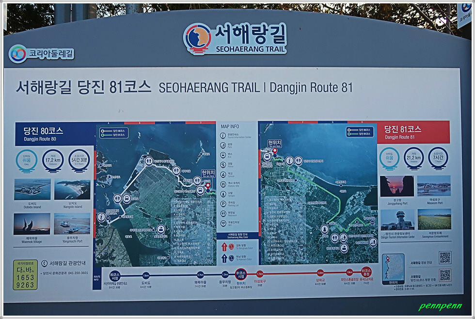 그런데 원래 서해랑길은 마섬항(당진시드론산업지원센터)에서 남쪽의 달맞이공원과 플라밍고CC의 사이를 가도록 설계되어 있지만 현재 당진기지본설비건설공사 및 당진공장송전선로 건설사업(25. 4. 22-27. 12. 31)으로 인해 석문방조제로 우회하라는 안내(두루누비 홈페이지)에 따라 석문방조제길(석문방조제로)을 따라 가야합니다. 이 경우 거리는 21.2km가 아니라 16.7km로 약 4.5km가 단축됩니다.