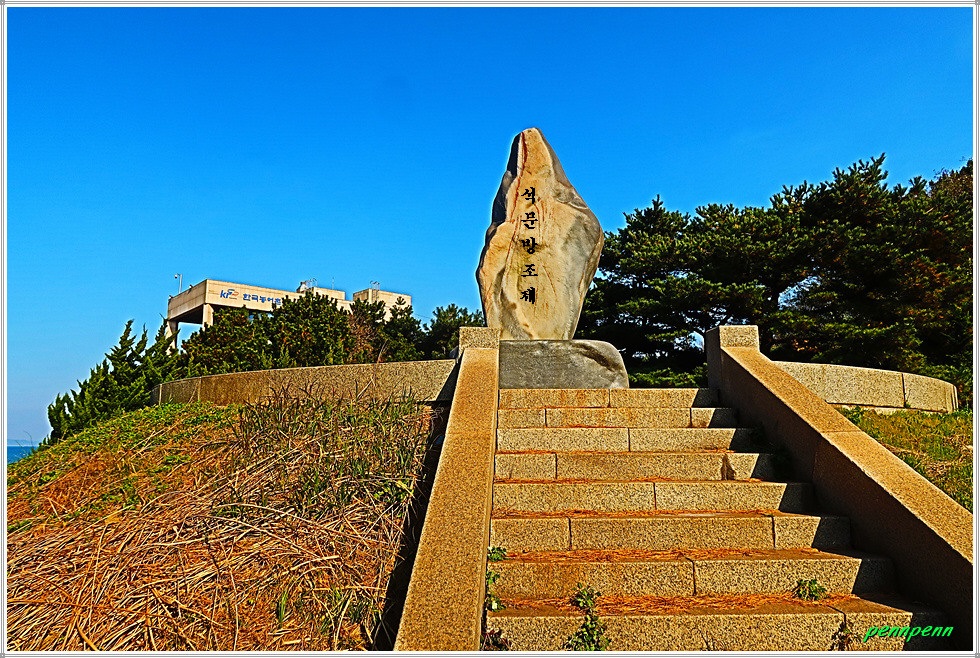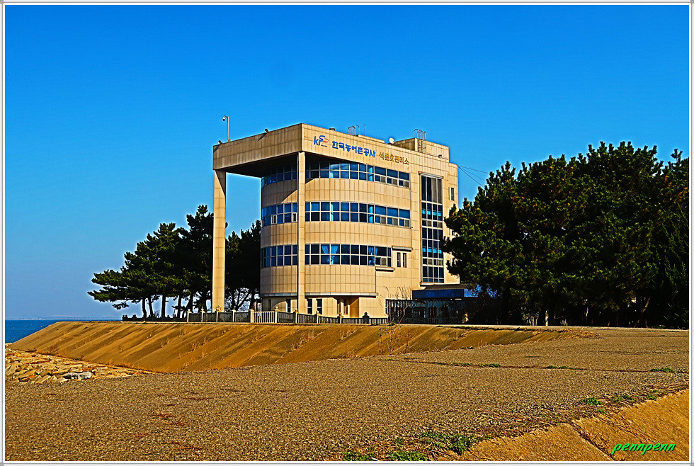 석문방조제 배수갑문과 석문교를 건너면 좌측에는 한국농어촌공사 석문호관리소가 있으며 그 뒤쪽에 석문선착장이 있다는데 직접 눈으로 확인하지는 못했습니다. 다만 석문호 관리소 앞에 큰 돌이 보여 석문방조제 준공기념표석일 것이라고 기대했지만 가까이 다가가 실물을 보니 실망스럽게도 돌의 앞뒤로 아무 글씨도 씌어 있지 아니한 맹탕표석입니다. 이를 좌대 위에 왜 올려놓았는지 모를 일입니다.