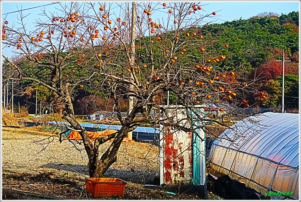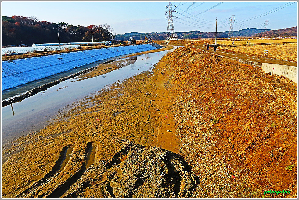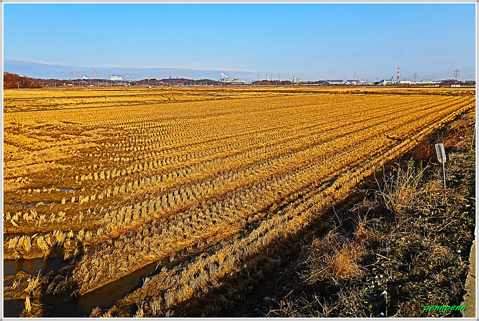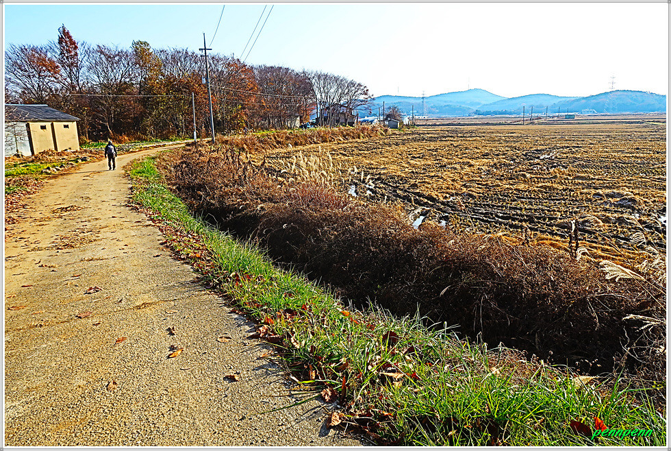 고갯마루에 올라 CU편의점이 있는 곳에서 동남쪽 소로로 진입합니다. 지나가는 길목에는 화사한 단풍이 남아 있군요. 길섶에 공장 건물이 보이는 가운데 녹색의 식물이 반겨줍니다. 농사용 도로처럼 보이는 길은 포장이 되어 있고 자동차 통행도 가능합니다. 가을추수가 끝난 논은 다가올 겨울을 기다리는 모습입니다. 논에는 곤포 사일리지(가축사료용 건초더미)가 많이 놓여 져 있네요.