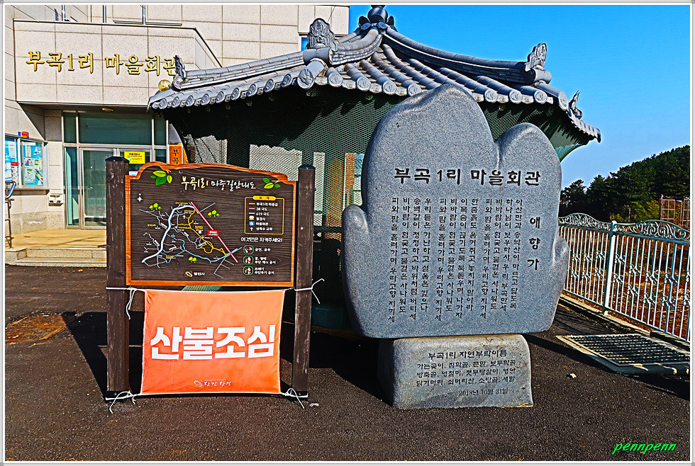 기념관을 둘러보고는 부곡1리마을회관을 지나 남쪽으로 갑니다. 부곡2교를 건너 북부산업로를 따라 가다가 북부산업로를 가로지르는 보행자 전용육교를 건너 계속 남하합니다. 아산국가산업단지 부곡지구 표석 옆에 서해랑길 83코스 지도가 있습니다. 이곳은 바로 복운리나눔숲입니다. 당진시 송악읍 복운리 소재 복운리 나눔숲은 사회·경제적 취약계층이 거주하는 녹지취약지역 생활권 주변에 녹지환경을 개선해 국민 여가활동 및 복지 증진에 기여하는 사업으로 산림청 산하 녹색사업단 공모사업에 선정돼 사업을 추진했습니다. 이곳에는 계수나무, 명자나무 등 수목식재, 산책로 포장, 시설물 설치 등으로 장애 유무, 연령 등에 관계없이 모든 시민들이 이용하기에 불편함이 없는 생활 속 녹색공간을 조성했습니다.