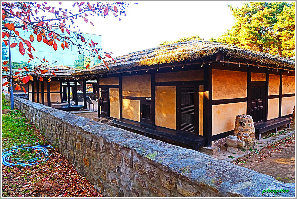 박물관 우측 야외전시장에는 우리의 전통가옥인 초가를 전시해 놓고 있습니다. 초가는 볏짚, 억새, 갈대, 띠, 풀 등을 이용하여 지붕을 덮은 집을 통틀어 가리키는데 벼농사가 시작된 삼국시대부터는 볏짚으로 지붕을 덮기 시작하였으며, 볏짚은 쉽게 구할 수 있는 재료로 방수와 단열효과가 뛰어 났기 때문입니다. 재료와 구조면에서 친자연적인 초가는 벽을 쌓고 구들을 놓아 추위를 이겨내는 조상의 지혜와 안빈낙도(安貧樂道)의 모습을 보여주는 전통건축물입니다.