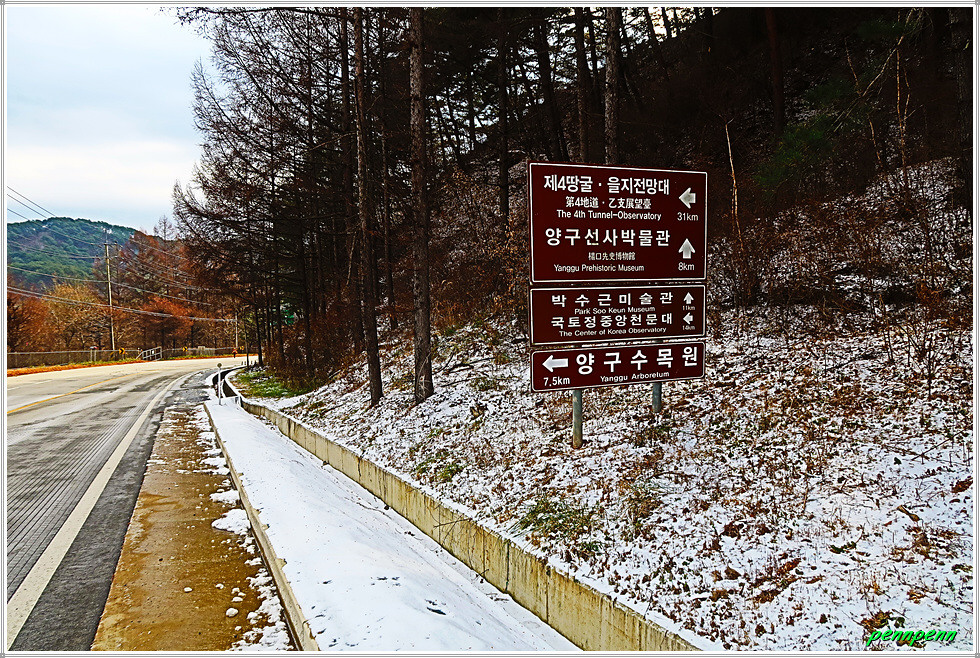 오늘 약 13km를 걷는데 3시간 15분이 소요되었습니다. 수도권 지역에서는 이번 첫눈이 상당히 많이 내렸는데 강원도 양구지방은 예상보다 눈이 적게 내린 탓인지 일부 응달을 제외하고는 눈이 거의 녹아 걷는데 불편은 전혀 없었습니다. 다만 전 코스가 포장된 도로여서 발바닥 촉감이 딱딱했고, 3곳의 전투전적비를 제외하고는 볼거리가 없어 그냥 자연을 벗 삼아 걷는데 만족해야했습니다. 트레킹을 시작했을 때는 체감기온이 영하 7도였지만 점점 기온이 높아졌고 바람이 전혀 불지 않아 겨울날씨치고는 제법 포근했습니다.