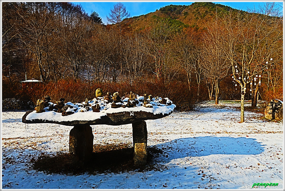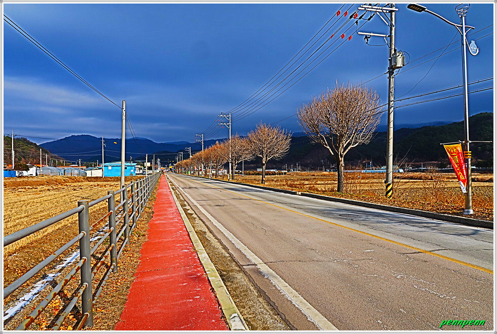 덕곡리를 지나가는데 가지만 앙상하게 남은 가로수가 마치 분재 같습니다. 비닐하우스 안에는 시래기를 건조시키고 있는데 그 수량이 엄청 많군요. 임당리 임당초등학교 앞에는 구한말 교육사업에 매진한 정응진(1843-1922)을 기리는 권학비(勸學碑)가 세워져 있습니다. 군장병 휴게쉼터와 동면사무소를 지나 동면청소년 문화의 집에서 우측으로 진입해 조금 가다가 개천변을 따라 북상합니다.