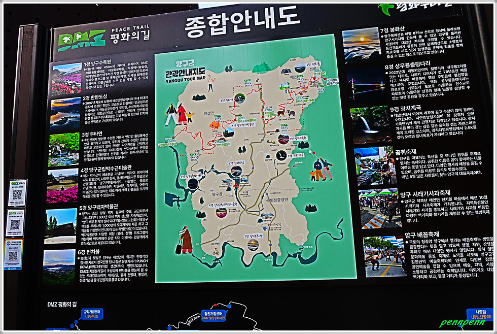 전시실에는 소지섭이 영화와 드라마 촬영 때 입었던 의상과 스틸 사진으로 소박하게 꾸몄다고 하는데 이번에 현장에 가보니 현재 운영을 중단한 모습입니다. 갤러리 맞은편에는 평화의 길 종합안내도(양구 지역)와 가 세워져 있습니다. 백석산지구 전투는 6.25전쟁이 한창이던 1951년 8월 중순부터 10월 하순까지 중동부 전선의 전술적 요충지인 백석산 고지를 탈환하기 위해 국군 7사단과 8사단이 북괴군 12사단과 32사단을 격퇴한 전투입니다. 오늘 걷는 이 길은 양구 10년 장생길이기도 합니다.