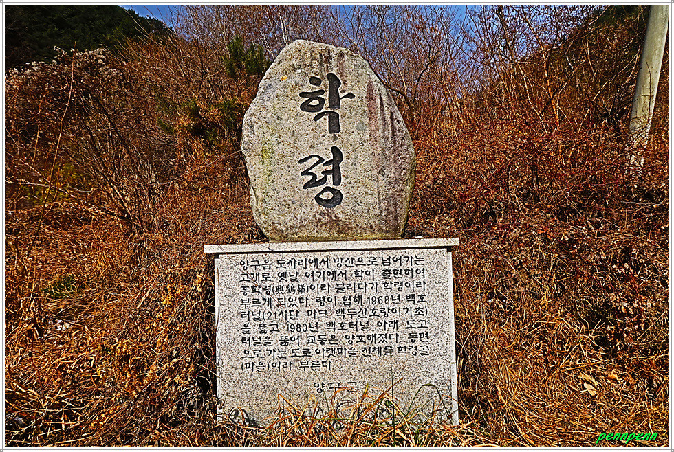 터널을 통과하니 우측에 학령 표석이 놓여 있습니다. 학령은 양구읍 도사리에서 방산으로 넘어가는 고개로 옛날 여기에서 학이 출현하여 흥학령(興鶴嶺)이러고 불리다가 학령이라 고쳐 부르게 되었습니다. 도로 우측에는 자작나무가 숲을 이루고 있군요. 좌측 아래쪽에는 학령터널을 빠져나온 460번 지방도로가 지나갑니다. 도고터널의 통행을 금지해도 차량들은 학령터널을 이용할 수 있어 통행에 불편함이 전혀 없습니다.