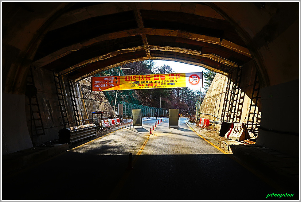 오르막 차로를 가다보면 삼거리 갈림길인데 여기서 좌측의 도고터널방면으로 갑니다. 닭갈비와 막국수집을 지나면 도고터널입니다. 12월 5일부터 내년 3월 말까지는 겨울철 폭설과 결빙 및 낙석에 따른 안전사고 예방을 위해 차량통행이 금지된 상태입니다. 따라서 우리는 길이 600m의 터널을 안전하게 통과할 수 있었습니다.
